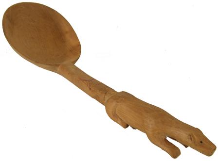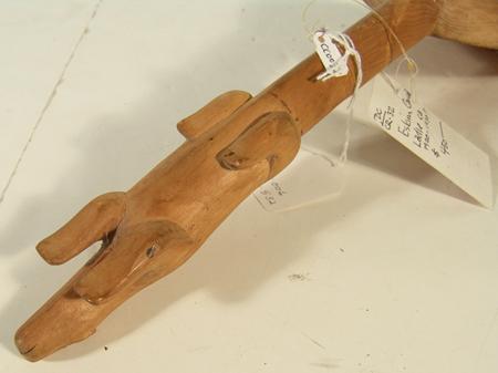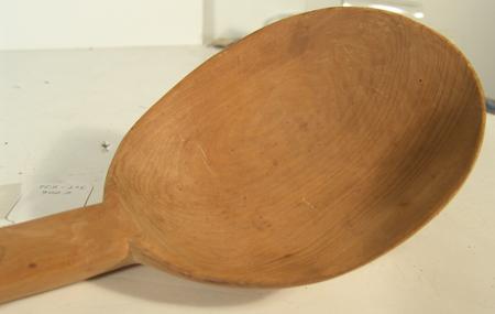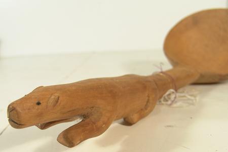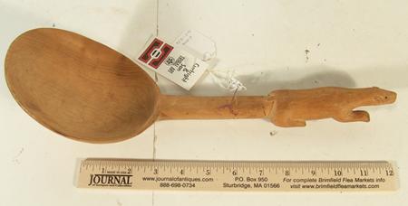 Unique hand carved spruce ladle with a polar bear effigy handle. Condition: very good, used. 14-1/2" x 5"