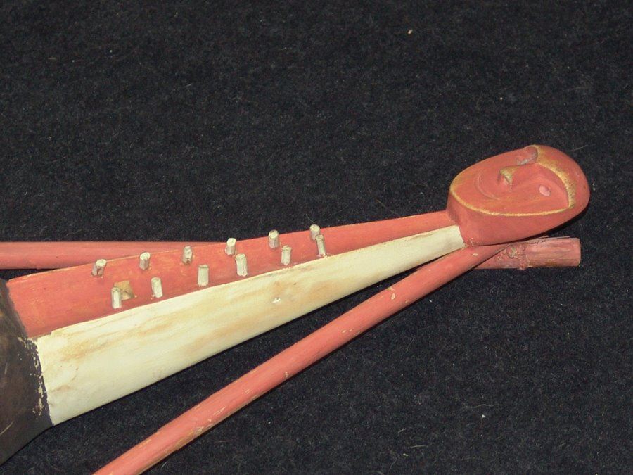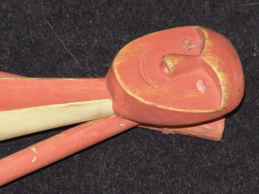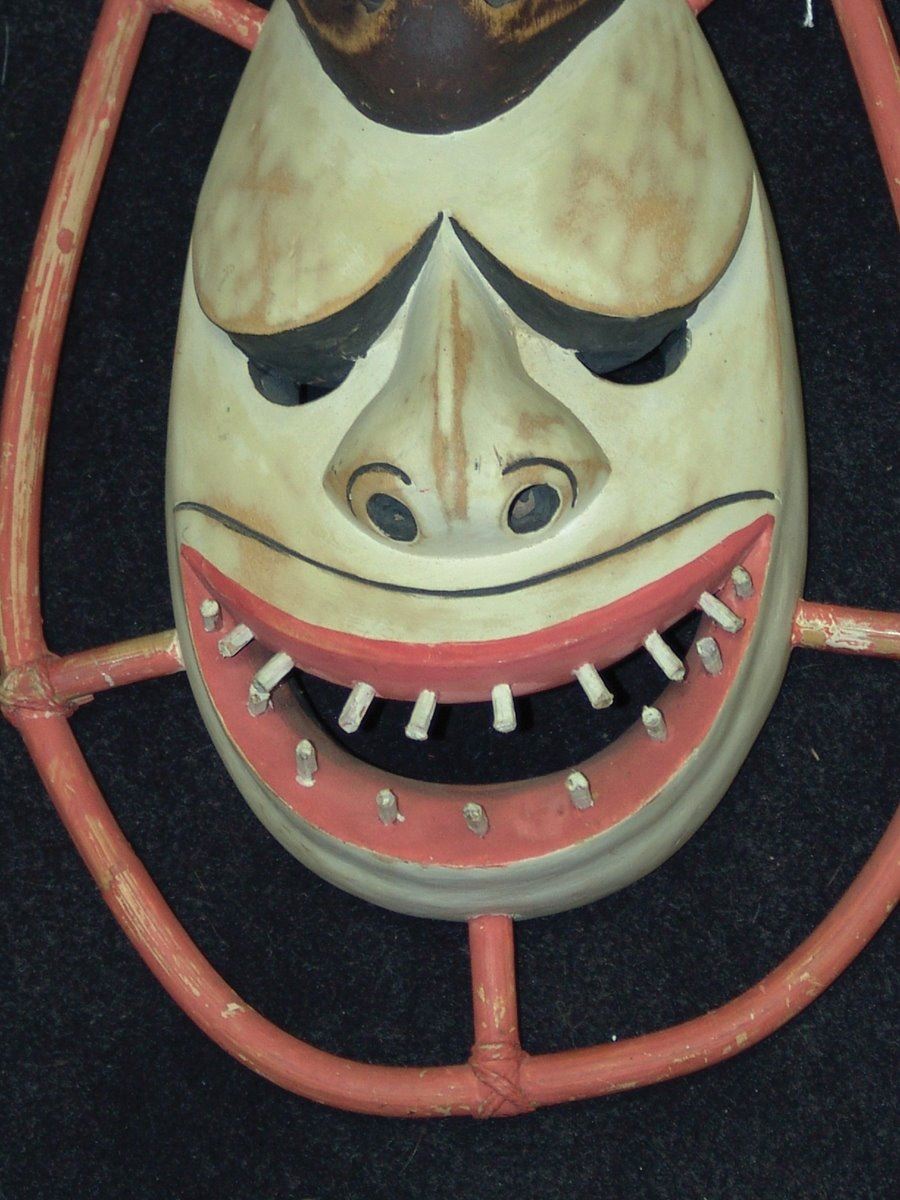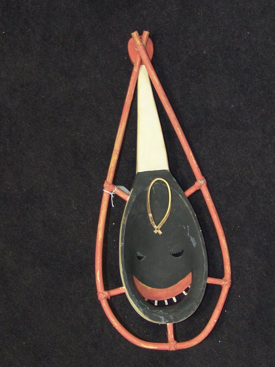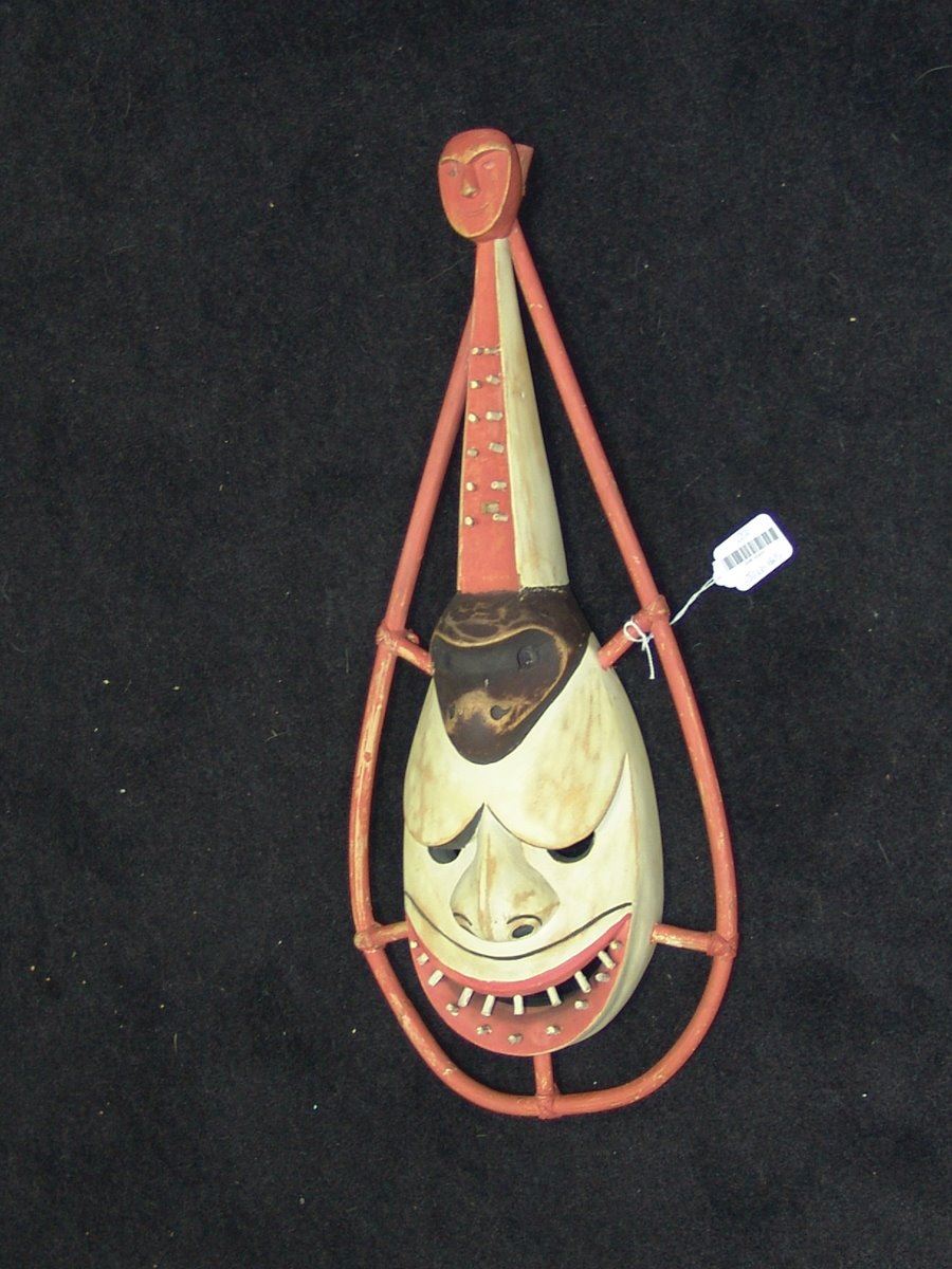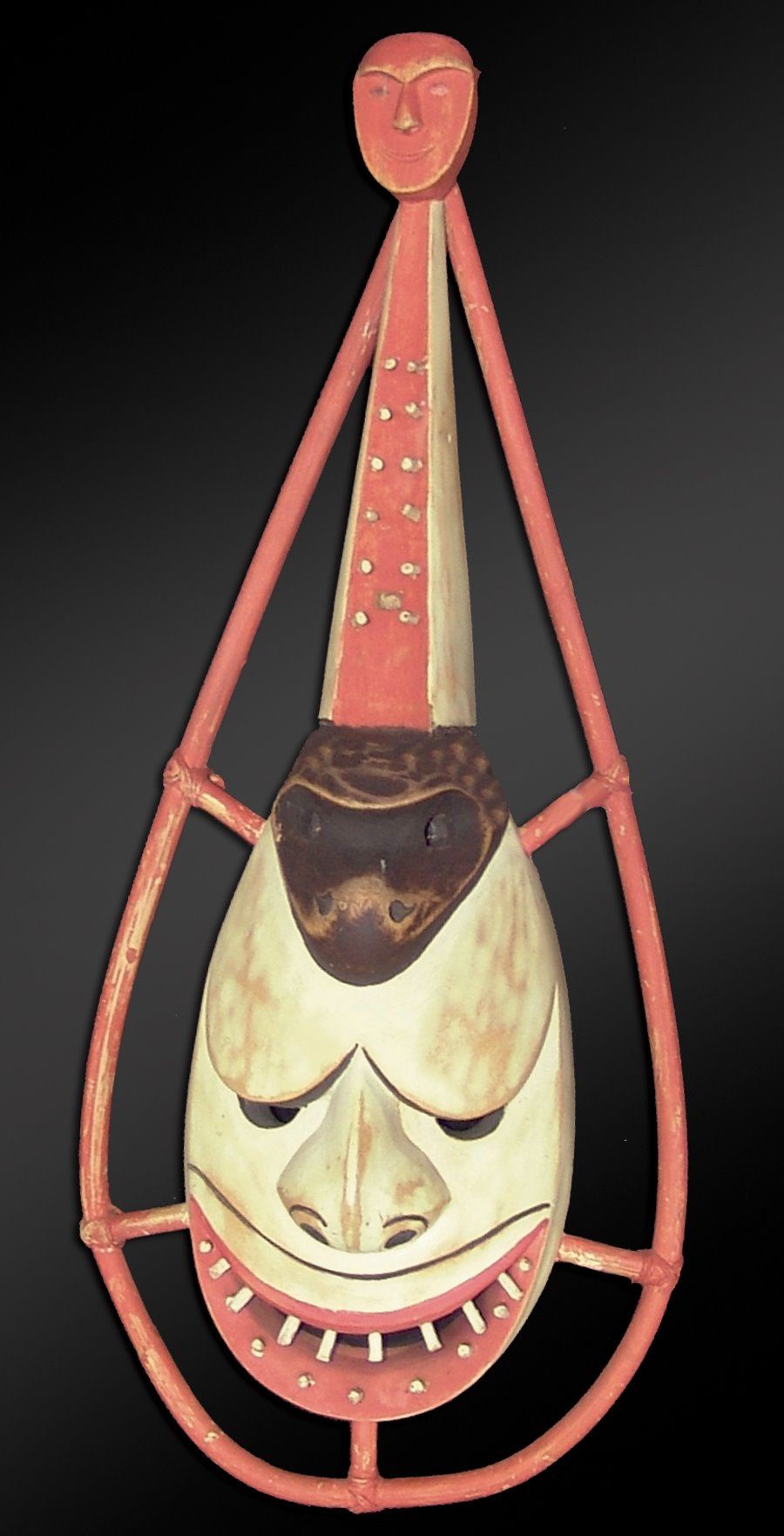 Beautiful hand carved and painted wooden Inua Reindeer Man mask done in elongated form with three faces, bentwood frame and peg details. Used in ceremonies calling the reindeer back. Very good condition.,Early/Mid 1900s,22"