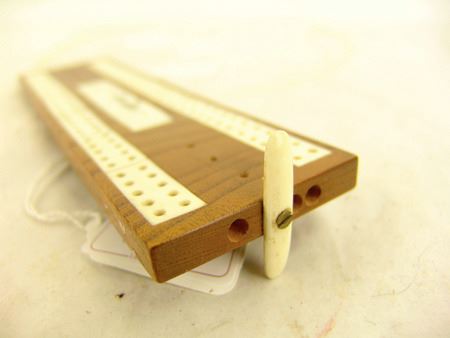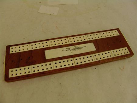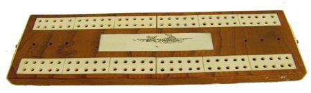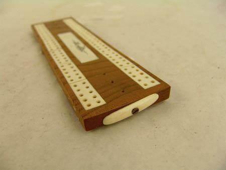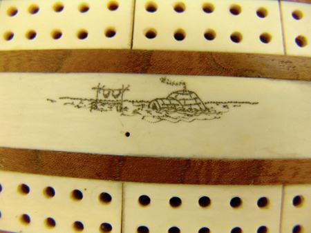 Mid/Late 1900s, Small ivory and wood board with scrimshaw igloo scene and holders for the pegs. Very good condition. 7-1/2" x 2-1/4"