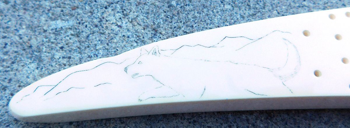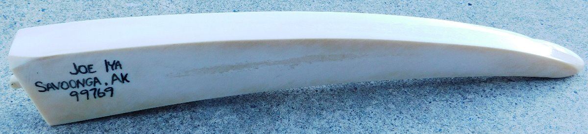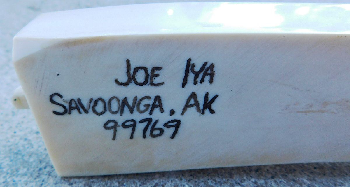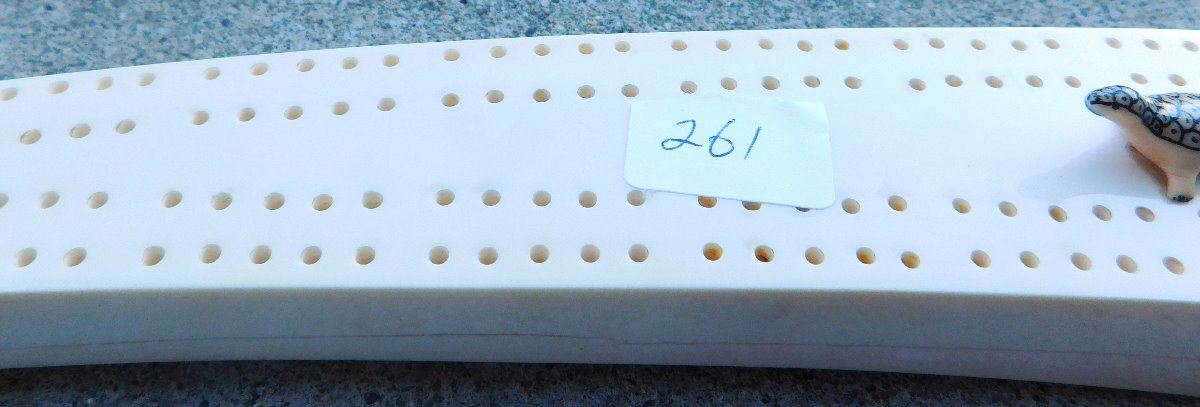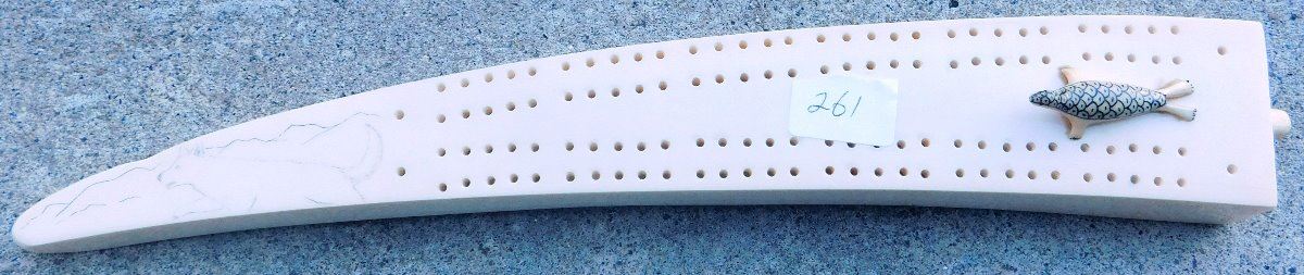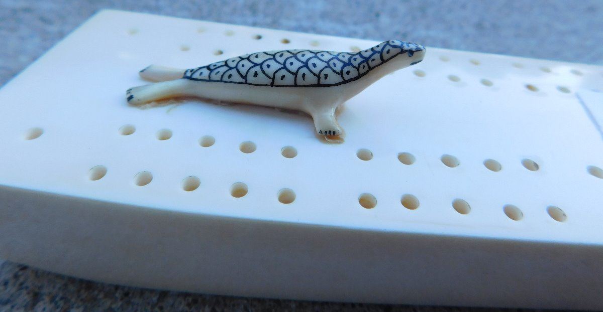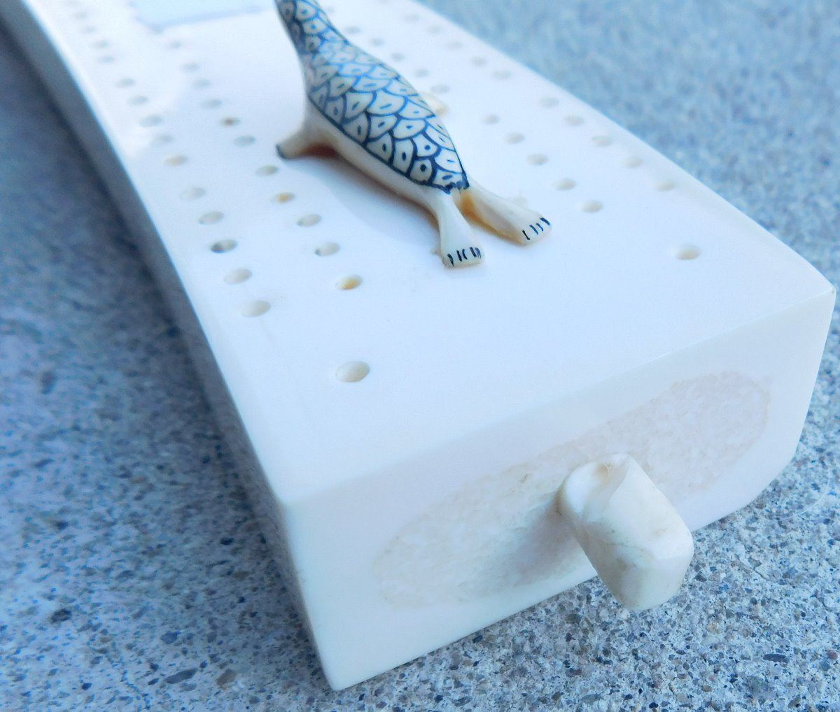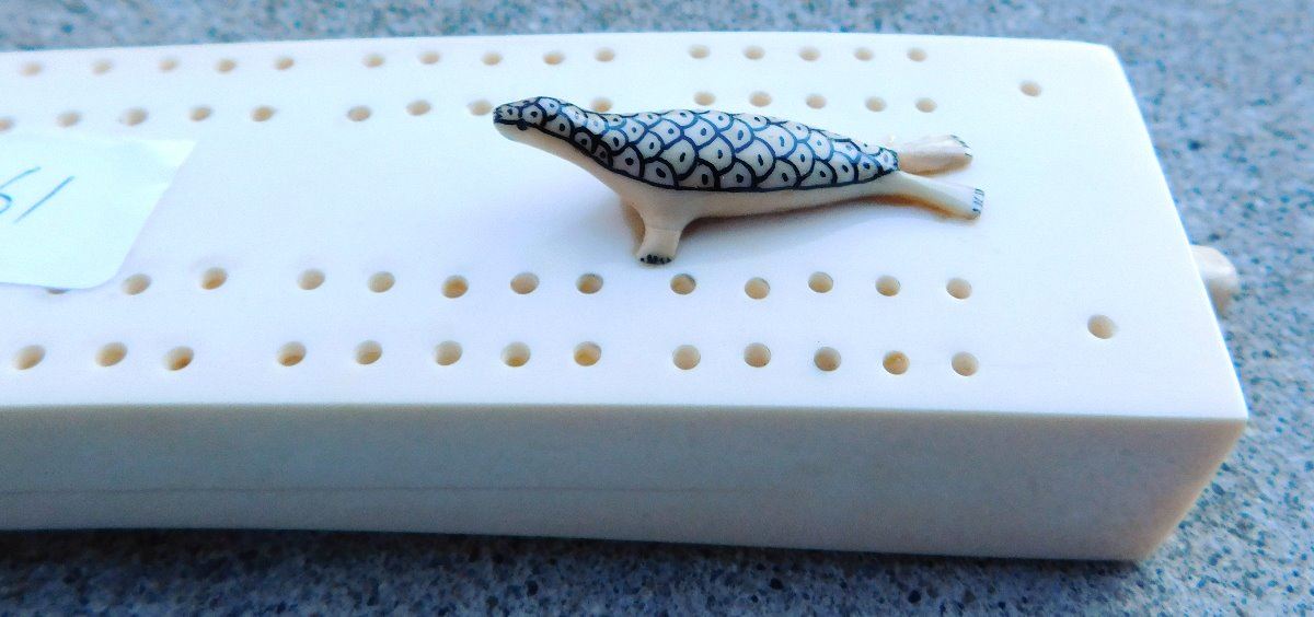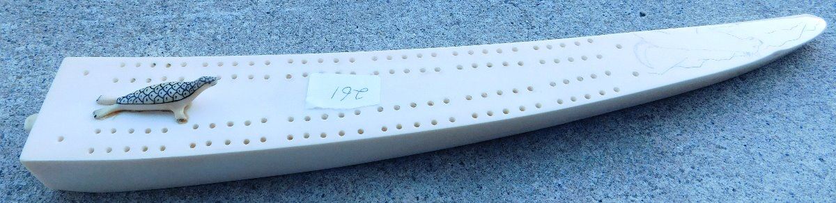 Eskimo Cribbage Board, circa 1980s. Made of bone, the item is 1.75" x 0.5" x 12". See artist's name in images. Has engraving and carved seal. Condition: Minor chip on base, see images. Shipping: $25.00 w/insurance and signature, double-boxed, due to length.