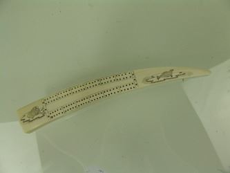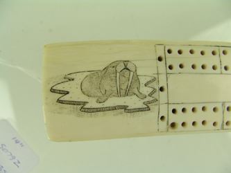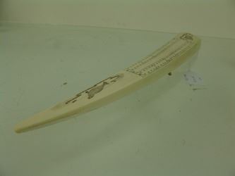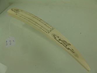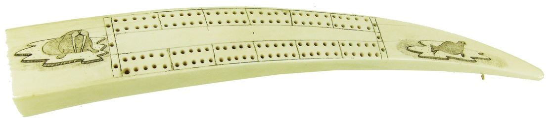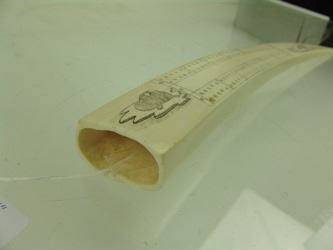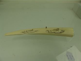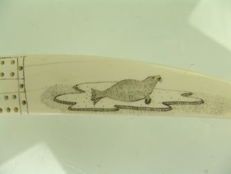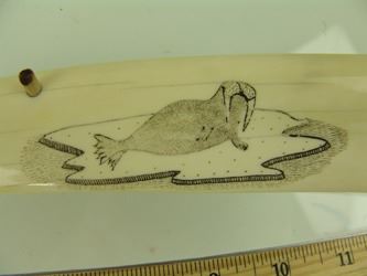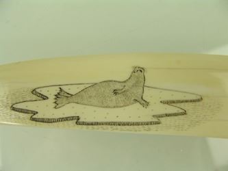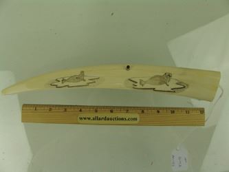 Traditional, carved and polished, walrus ivory tusk with very fine, inked scrimshaw detail that includes four ice floe scenes, two each on the top and bottom, each with a walrus or seal figure aboard. Very good condition. Mid/Late 1900s. 14"