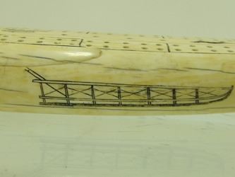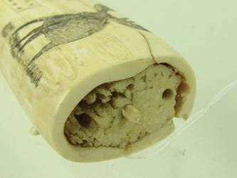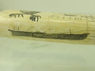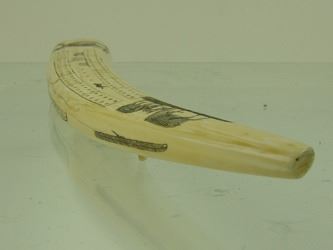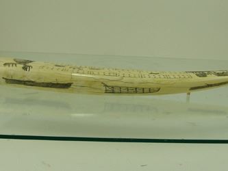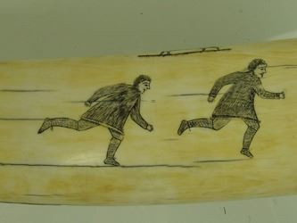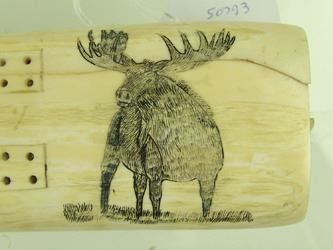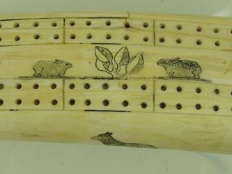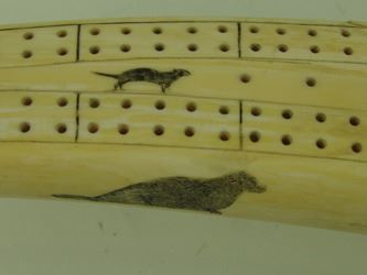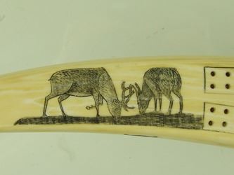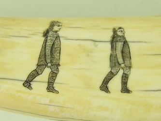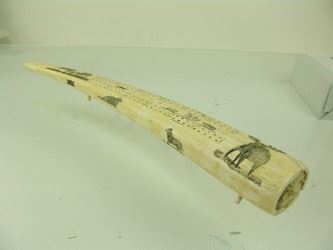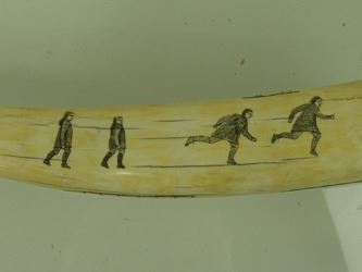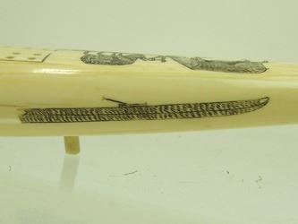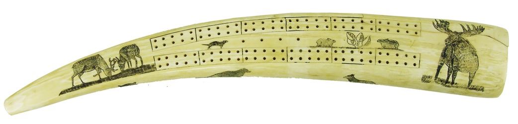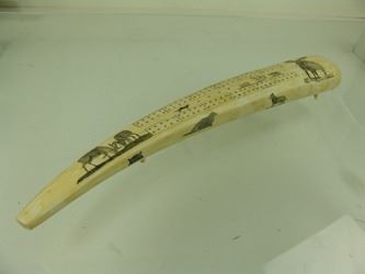 Impressive, larger sized, vintage, carved and polished walrus tusk, artistically covered with lavish, etched and inked scrimshaw figures including a pair of caribou, large moose, two hares, and a marmot on the top, two boats and a sled on one side, three small animals on the other side, and four Eskimo children playing on the bottom. Although the peg holder on the end is in place, the originanl cover for it is missing. Very good condition, one natural crack. Mid/Late 1900s. 19"