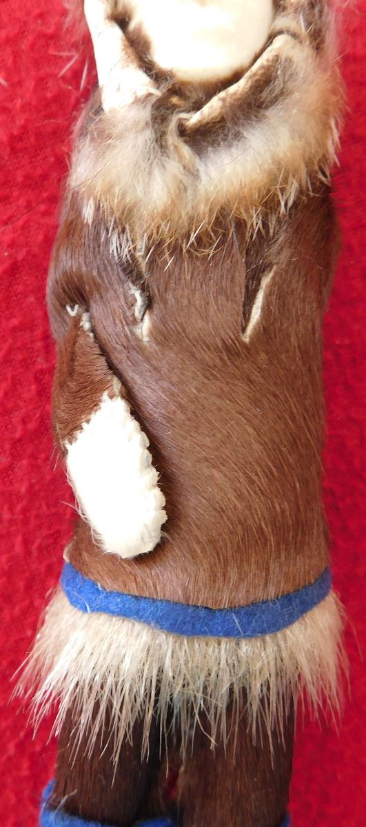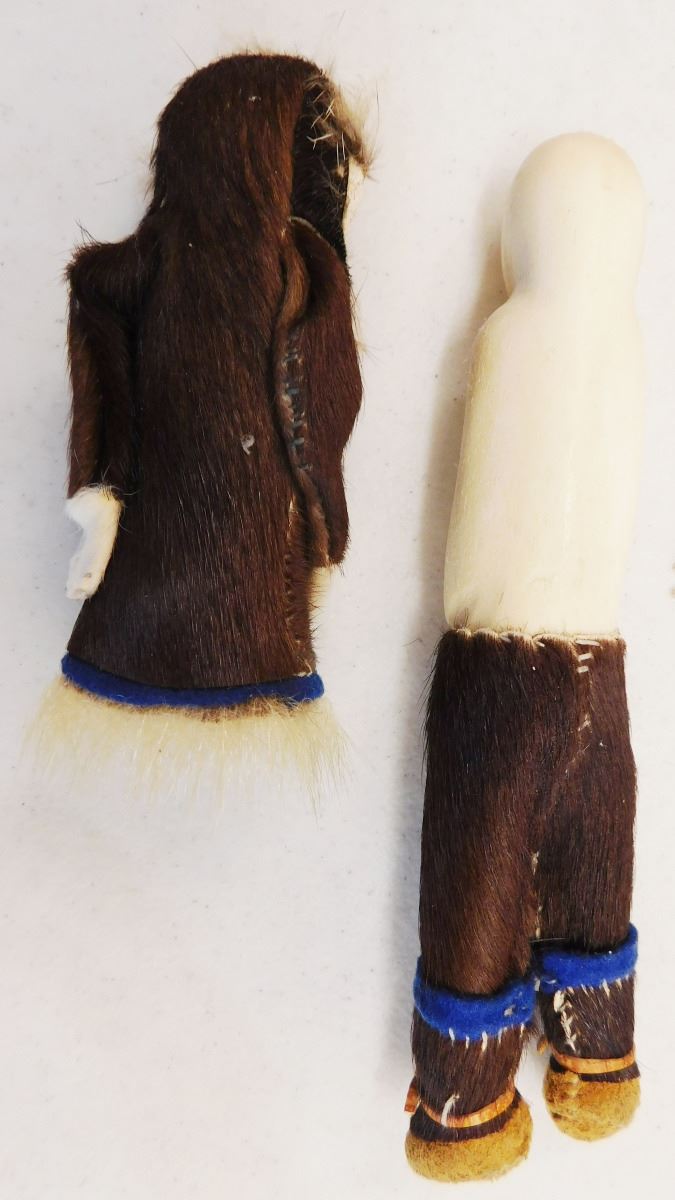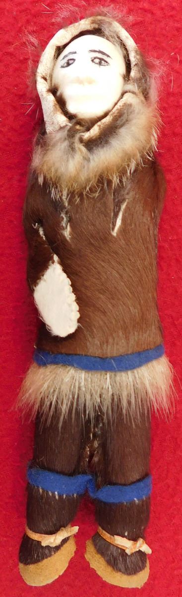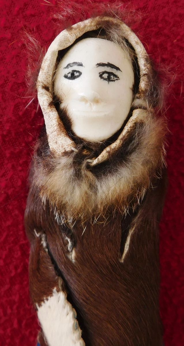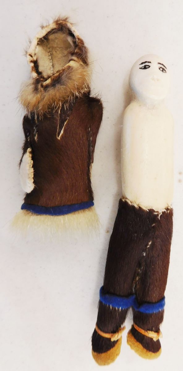 Eskimo Doll w/Clothes, circa 1900s. Made of animal skins and bone, the item measures 1.5" x 1.25" x 6". Eskimo. Condition: Very good, some fur loss to hood, see images. Shipping: $25.00 w/insurance and signature.