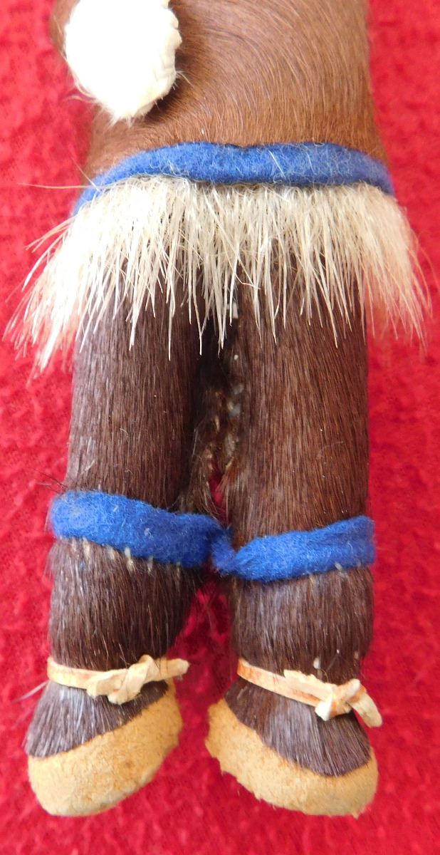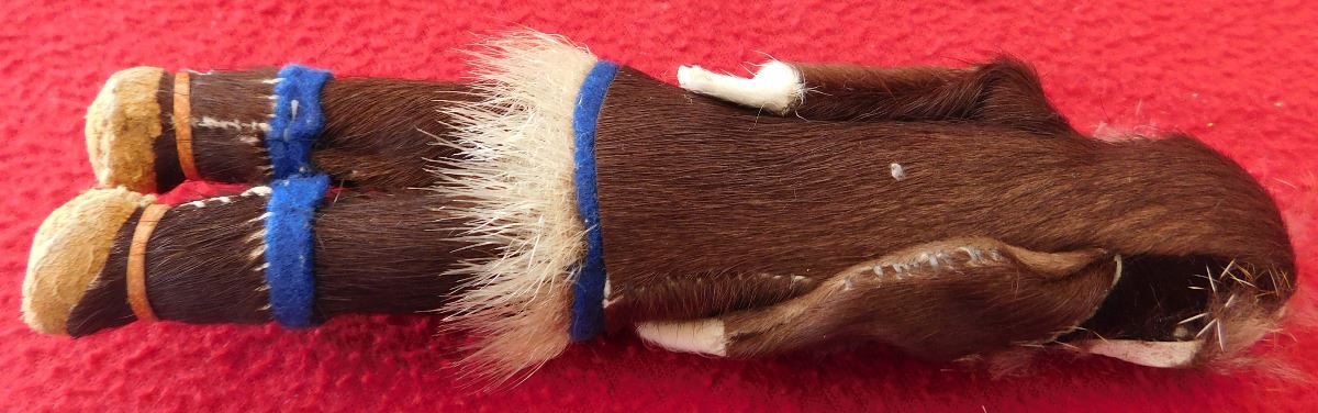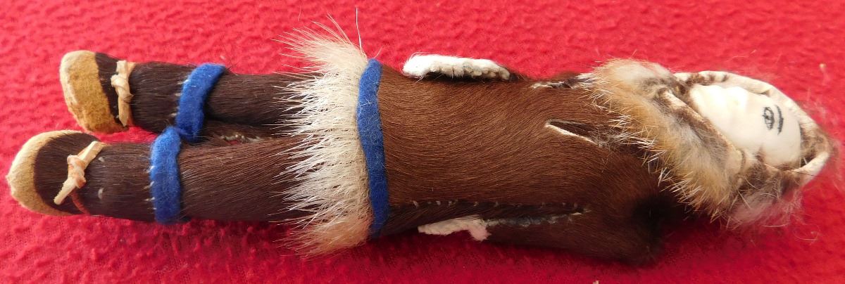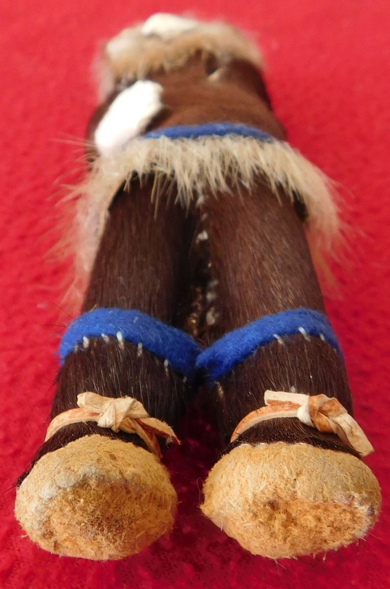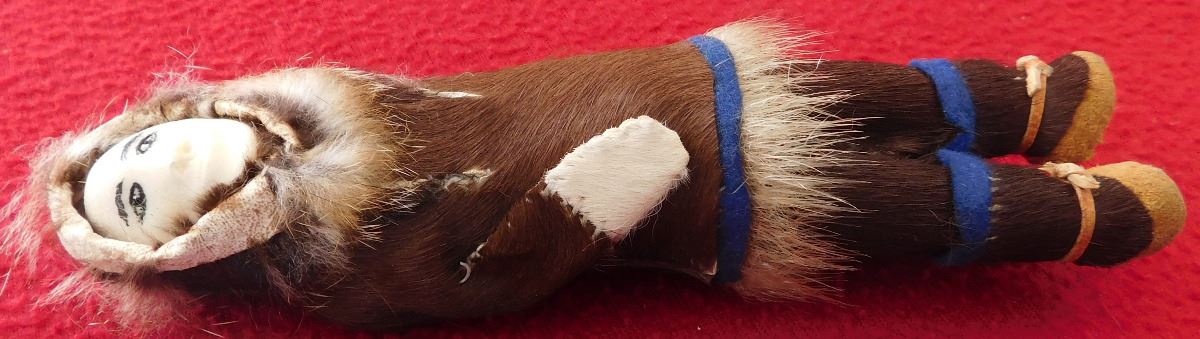 Eskimo Doll w/Clothes, circa 1900s. Made of animal skins and bone, the item measures 1.5" x 1.25" x 6". Eskimo. Condition: Very good, some fur loss to hood, see images. Shipping: $25.00 w/insurance and signature.