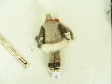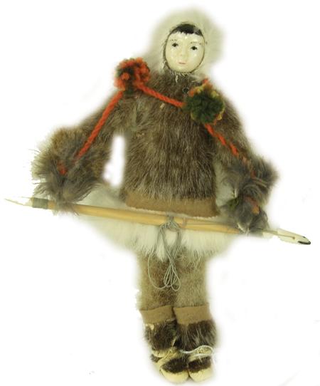 Circa 1970s, Fine hand crafted doll with full seal fur costume, mukluks, ivory tipped spear, and carved ivory face. Very good condition. 11" tall