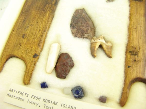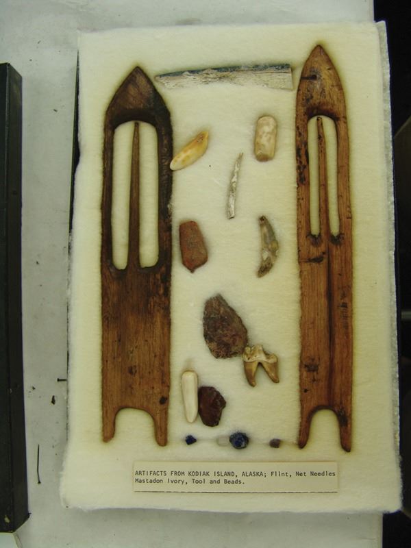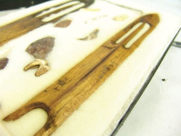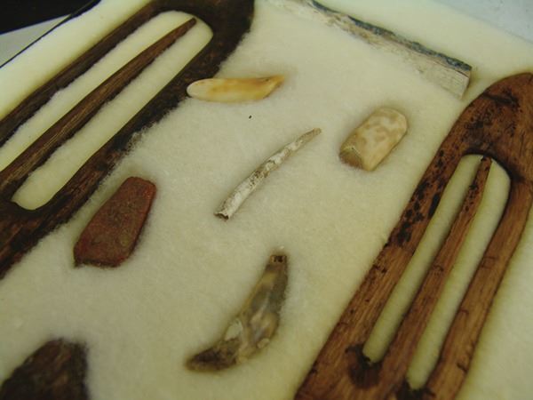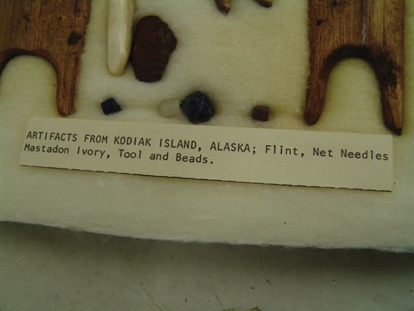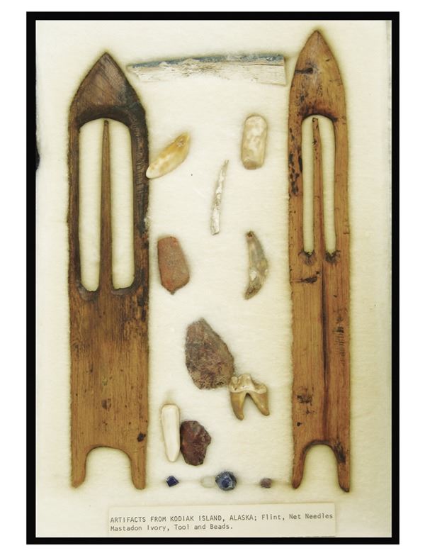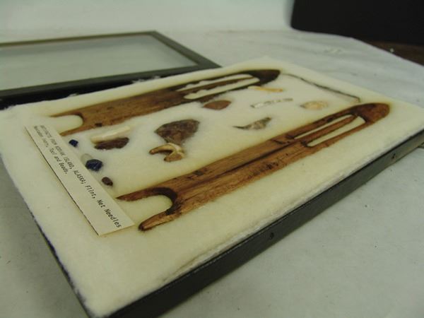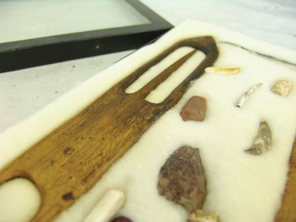 Framed display of old excavated items including flints, wooden net needles, fossilized ivory pendants, tools, and beads. Good condition.,Various Ages,Longest 10"