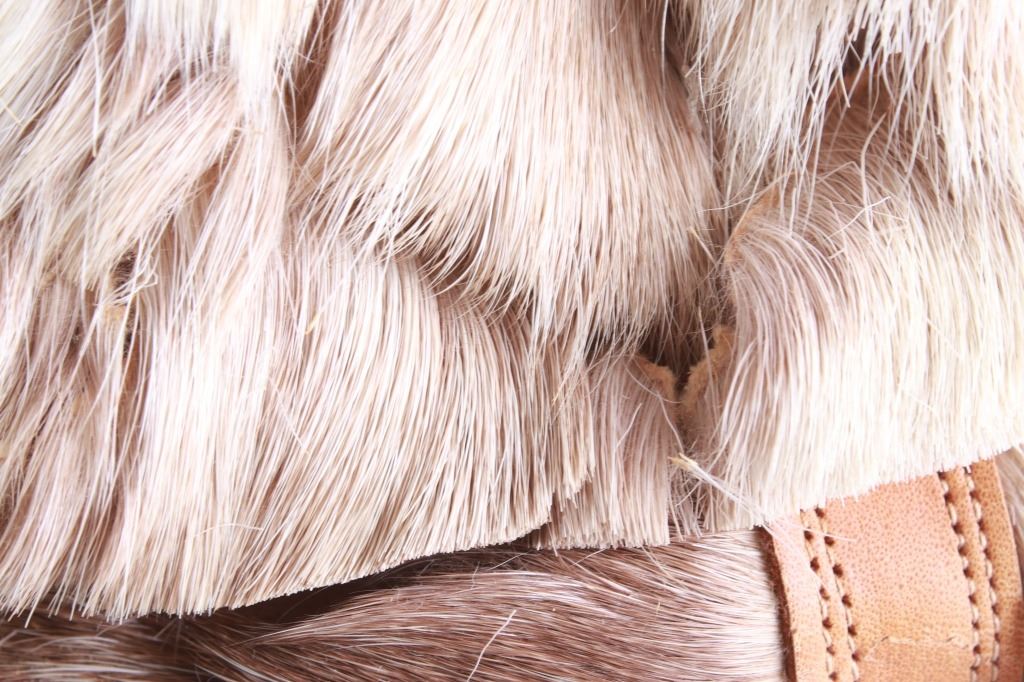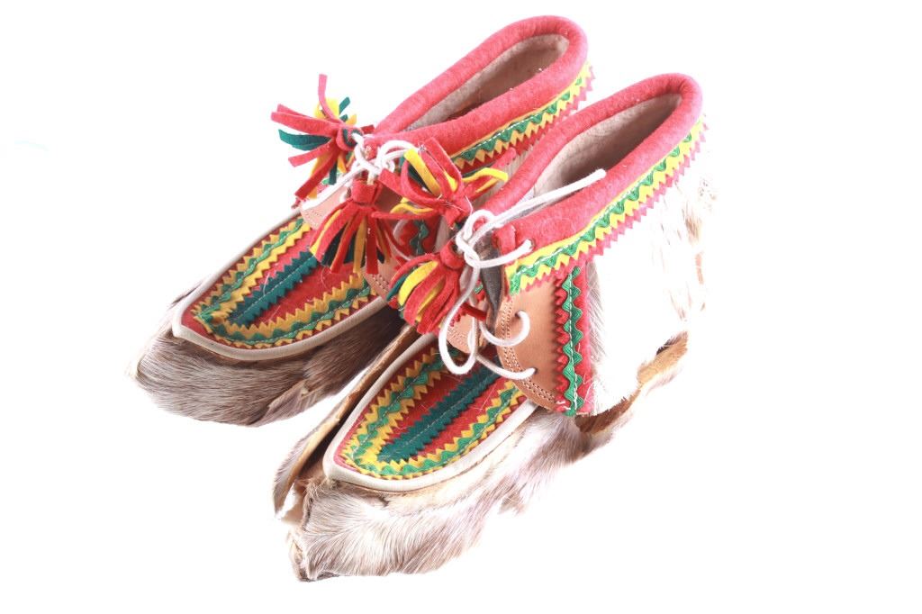 Featured in this lot is this Eskimo Inuit caribou hide muckluks circa 1920 - 1930's. The mukluks feature a wonderfully and professionally crafted caribou hide and shows a double backed felt construction with a scalloped fringe of green fabric. The condition of this pair of mukluks is poor with one of the soles being torn off the sole and some of the featured in this lot seems to be falling out and some wear to the outside walling of the left mukluk.. The measurements of this pair of mukluks are 5 3/4" x 10 1/2" x 3 3/4".