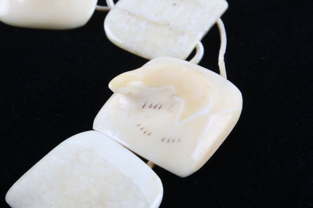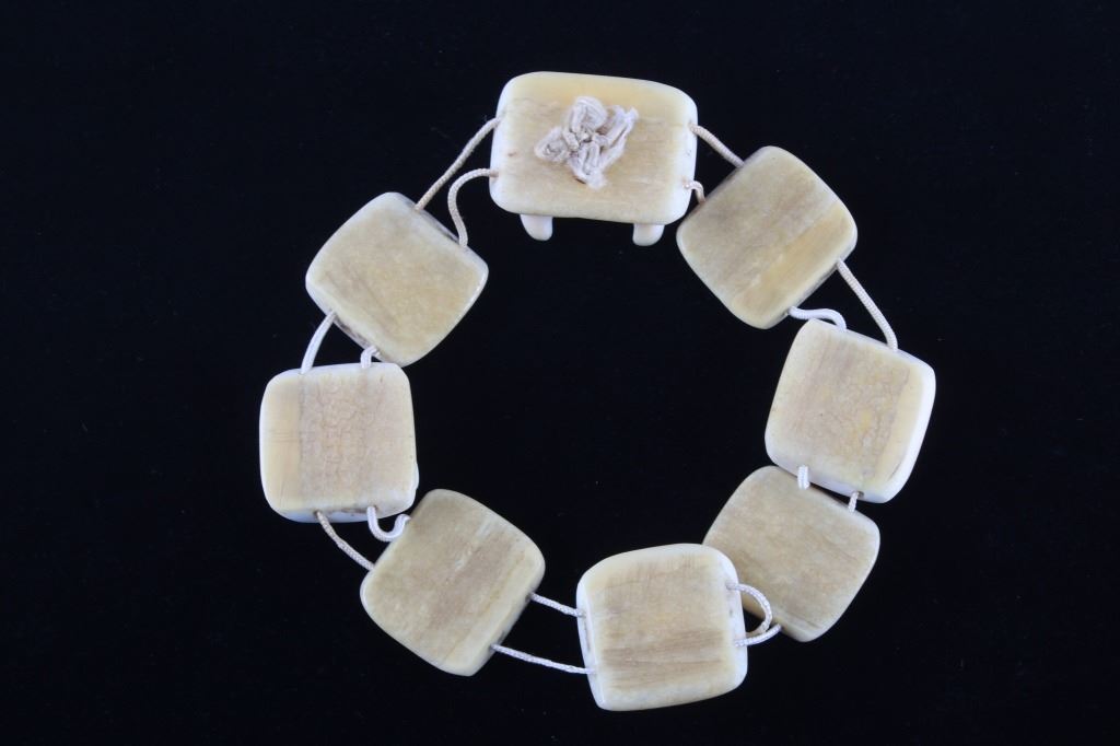 Featured in this lot is this Eskimo Inuit walrus tusk scrimshaw bracelets. There are two bracelets in this collection. The first is a plain walrus tusk bracelet with square examples of links of sampled walrus tusk on bungee cord. The second is a bracelet constructed from walrus tusk and shows Eskimo faces scrimshaw decorated into the face of the links. The condition of this pair of bracelets is good for the larger bracelet and poor for the scrimshaw bracelet with the bungee broken and leaving the piece flat. The measurements of this pair of bracelets are 11" in circumference and the broken bracelet is 7".