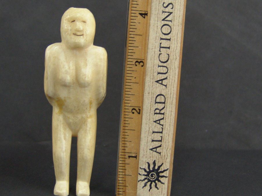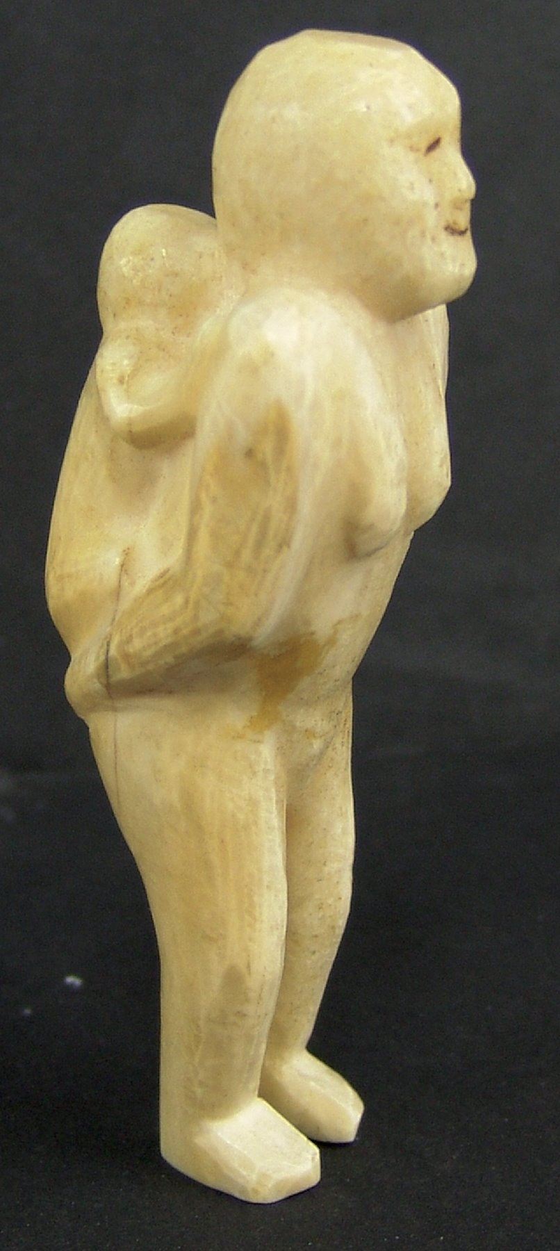 Early hand craved Eskimo ivory figure with scrimshaw details. This is a mother carrying her baby/child on her back. Very good condition.,Early/Mid 1900s,4"