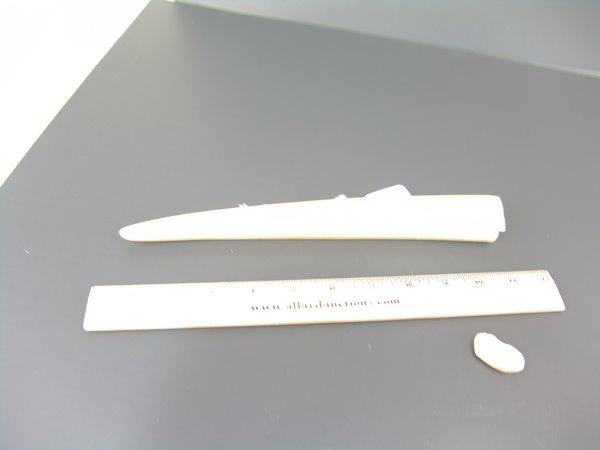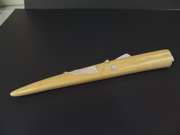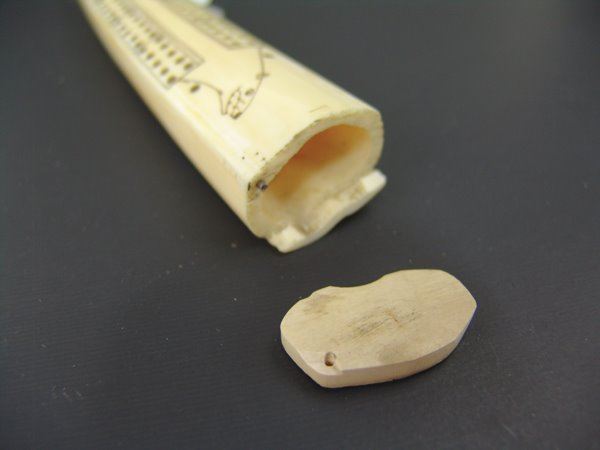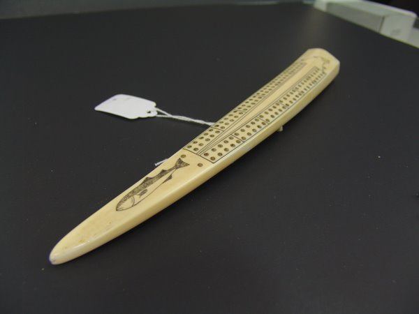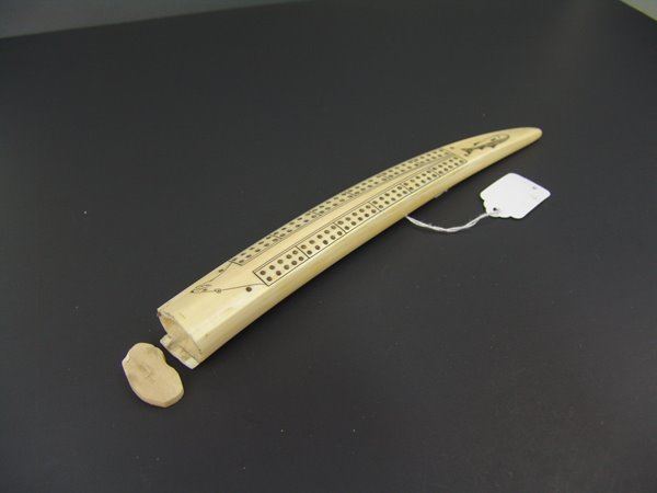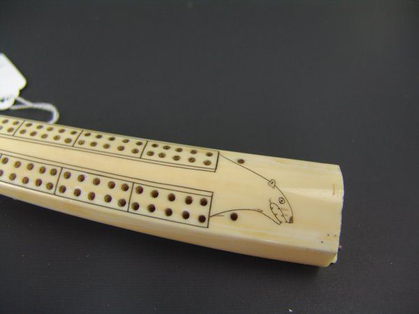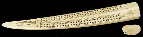 Mid/Late 1900s 10-1/2" Smaller, hand carved walrus tusk with peg board, fish figure, and polar bear head scrimshawed on the top. Very good condition, hinged peg holder damaged, no pegs.