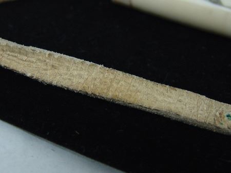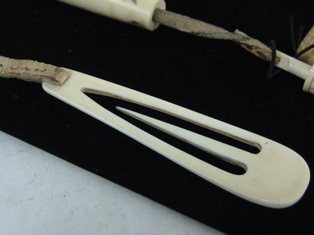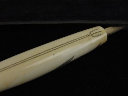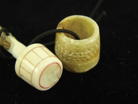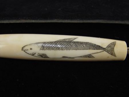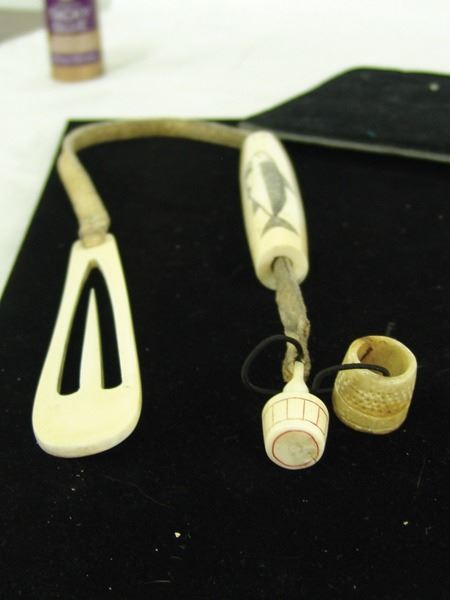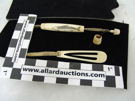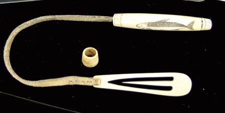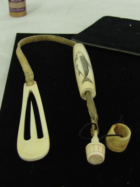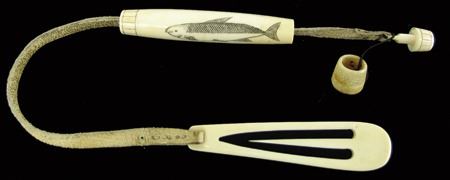A beautifully hand carved ivory needle case with scrimshaw of a Chinook salmon on the body. The cap is pulled to expose the leather thong where the needles are inserted, then the handle is pulled back through so the needles enter the case and the cap is replaced. Includes a handmade bone thimble. Very good condition. 22"
