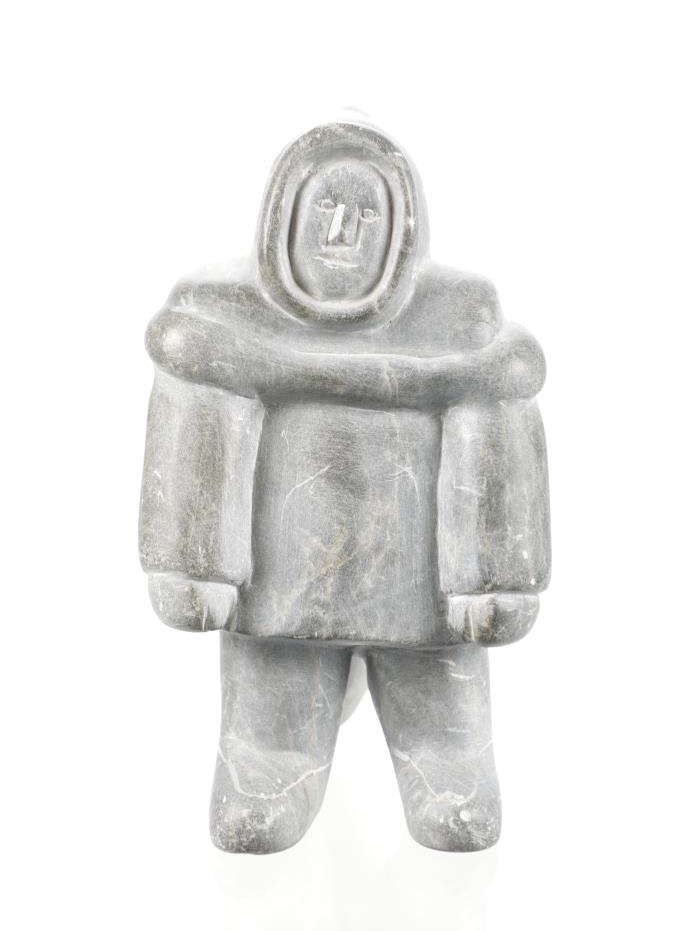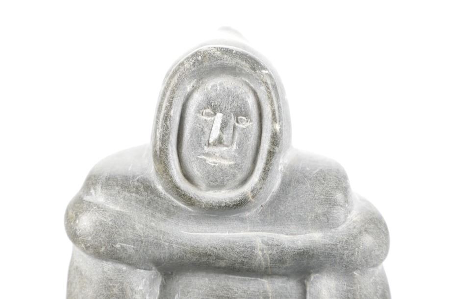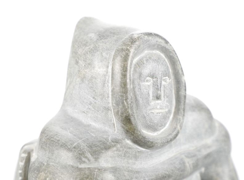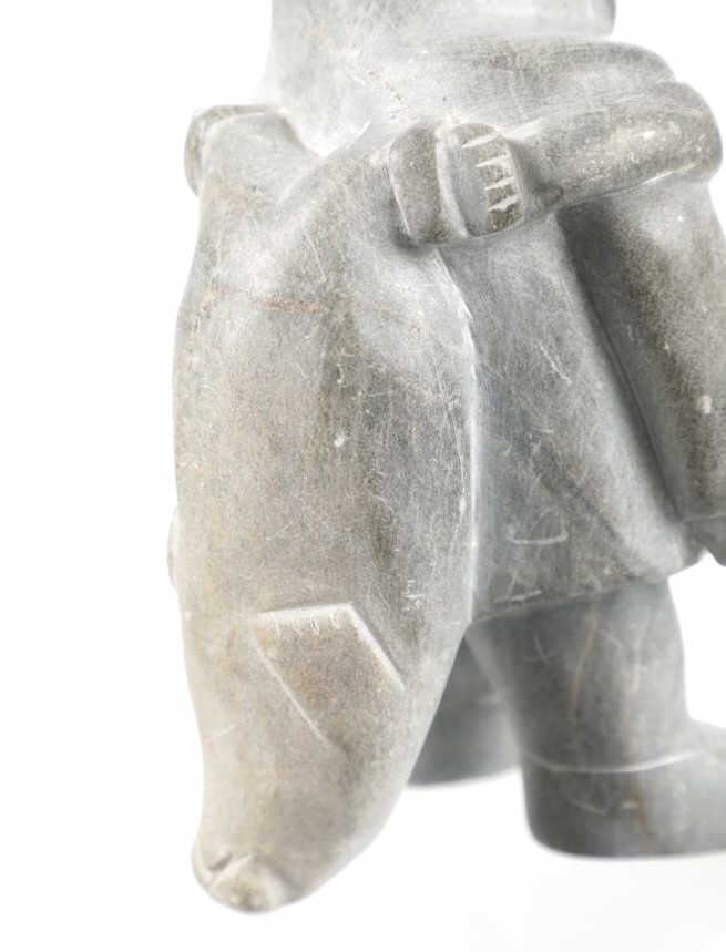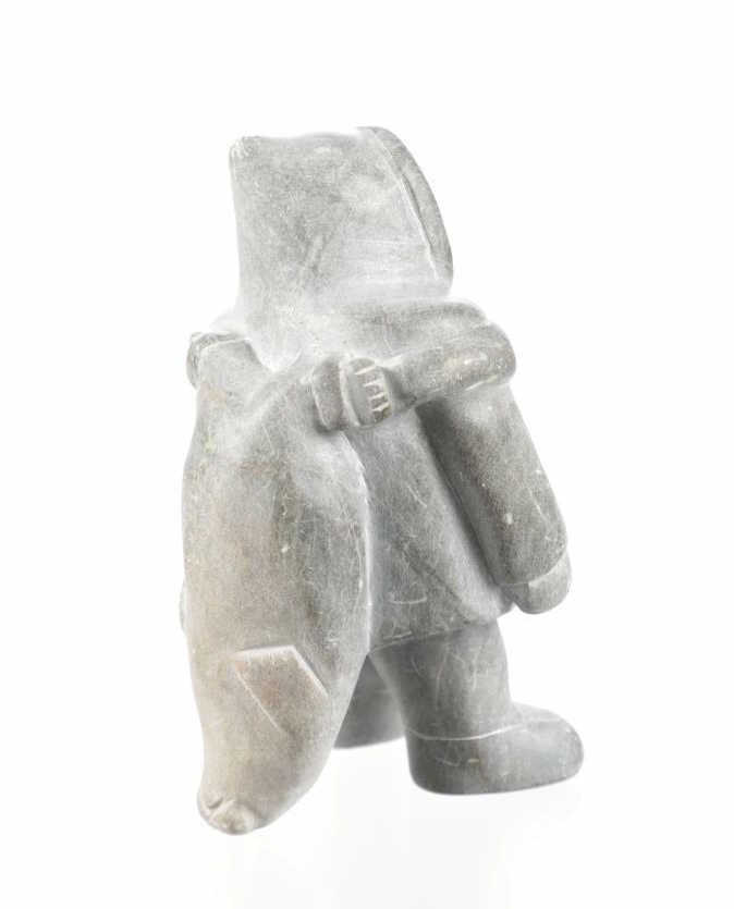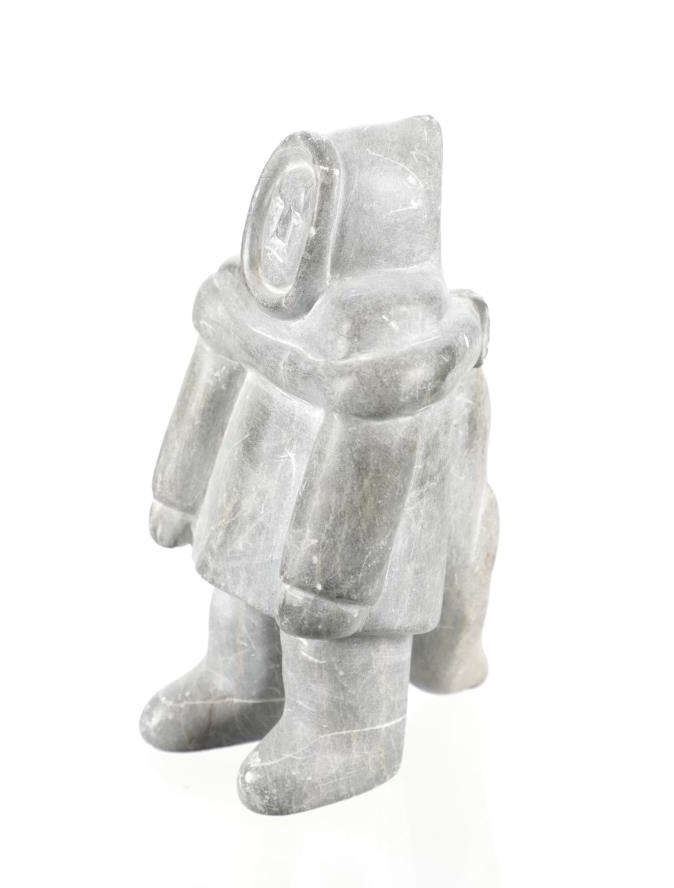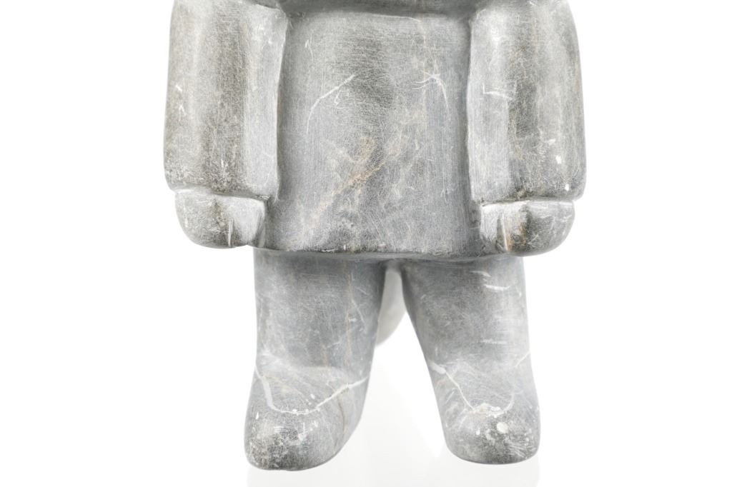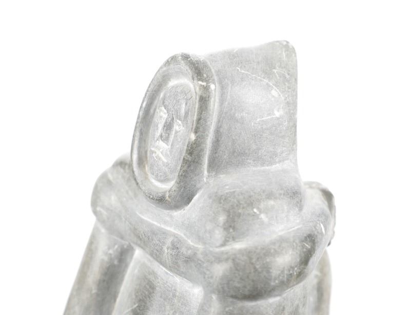 Featured in this lot is this soapstone native hunter carving from Eskimo artist K. Kumak circa 1970's. The carving features a wonderfully and professionally crafted soapstone construction that shows a Eskimo hunter in winter garments with a hunting pack on his back. The carving is marked on the bottom as follows: K. Kumak - Eskimo Art Canada - #02192 - 1975. The carving comes complete with an original receipt from the gallery of folk art The Chair House. The condition of this Eskimo Carving is good with no obvious signs of damage and shows good overall condition. The measurements of this carving is 7 1/2" x 4 1/4" x 4 1/2". The collective weight of this carving is 4lb 14oz.