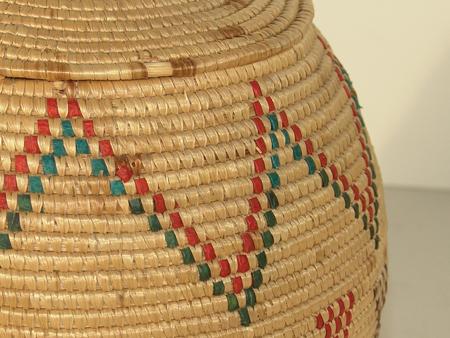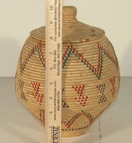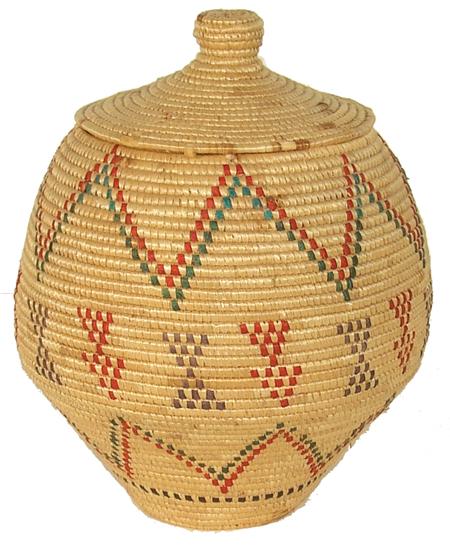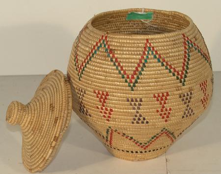 Finely woven coiled "Kipmuuk" lidded basket with 3-color arrow and zig-zag design. Condition: excellent. 9" x 8-1/2"