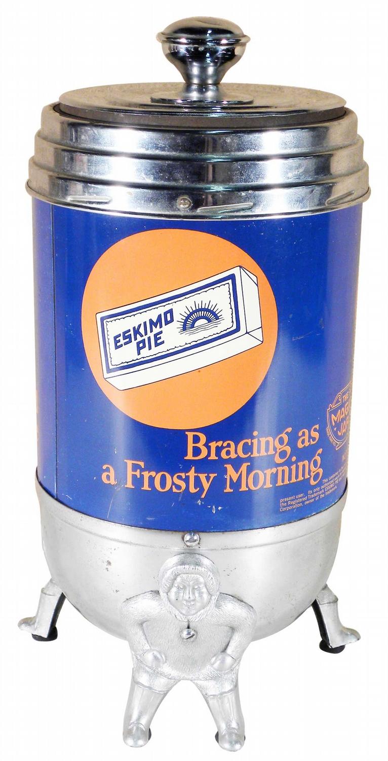Eskimo Pie Magic Jar Thermos. Tin with insulated canister, cork lid, figural eskimo feet. Eskimo Pie Corp. Louisville, KY. Some minor scratches otherwise excellent condition. 7 1/2 inch diameter X 16 inches tall.