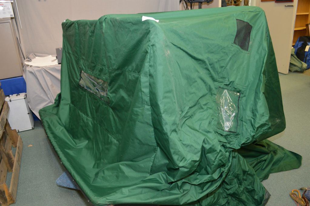 Eskimo Quick Flip III Ice Fishing Hut [ that can be pulled in snow ] c/w hand auger, ice fishing net, ice scoop, ice fishing rods, etc.