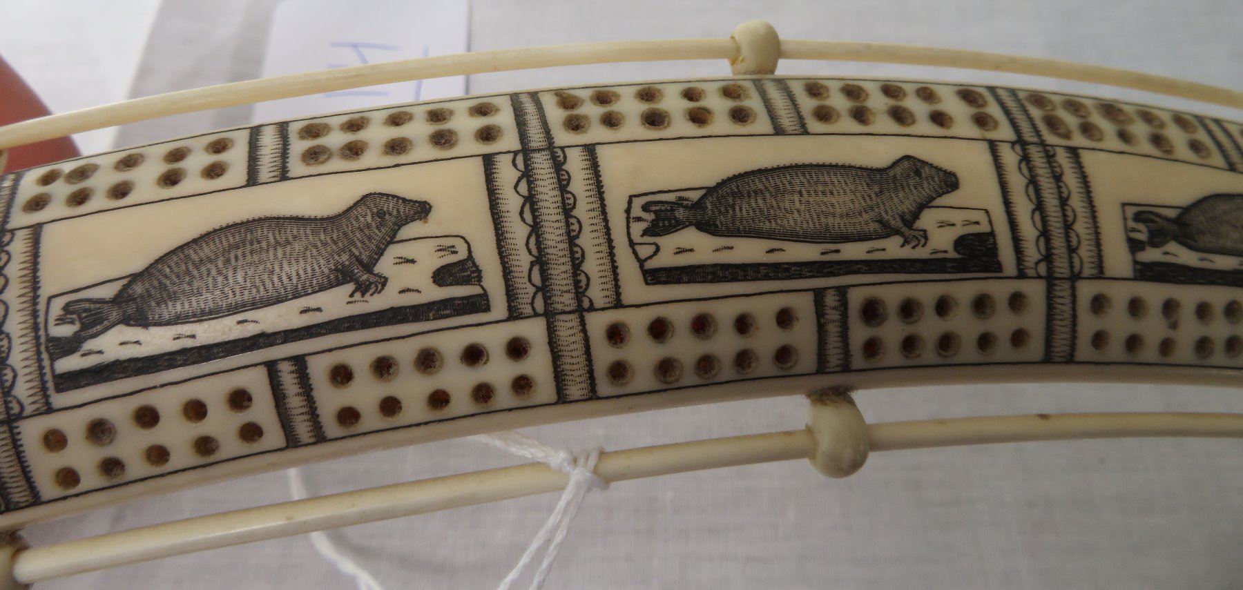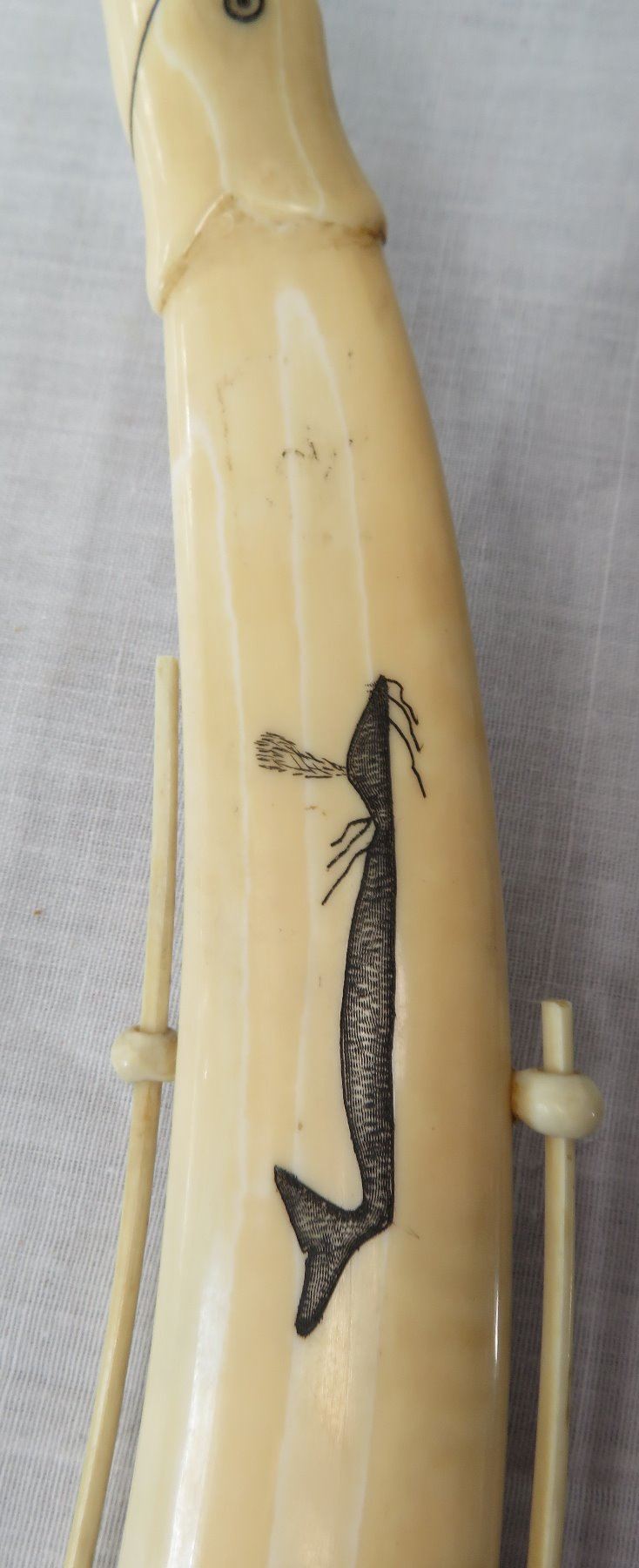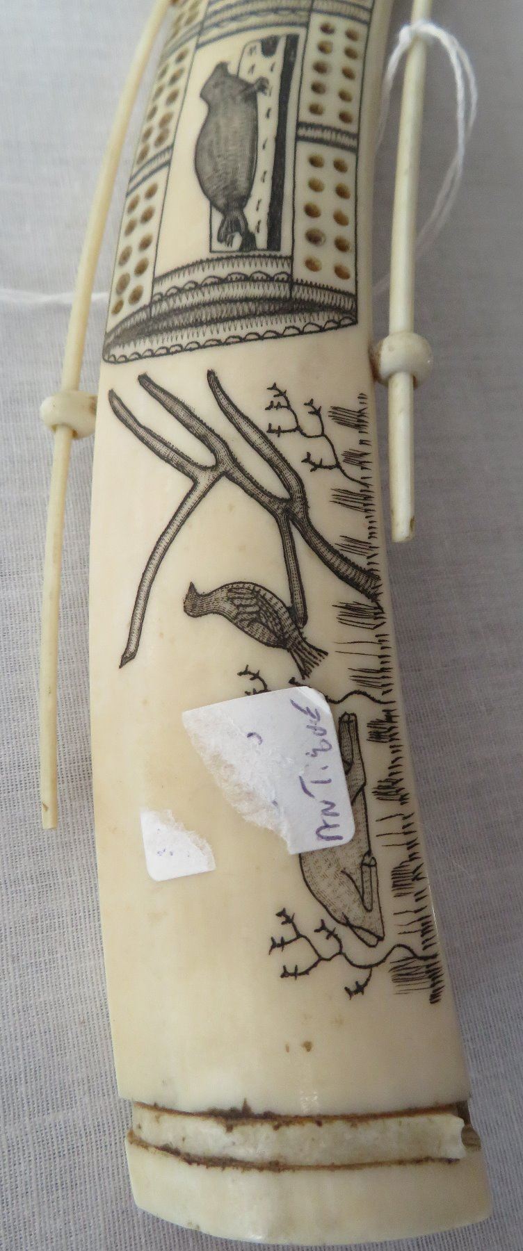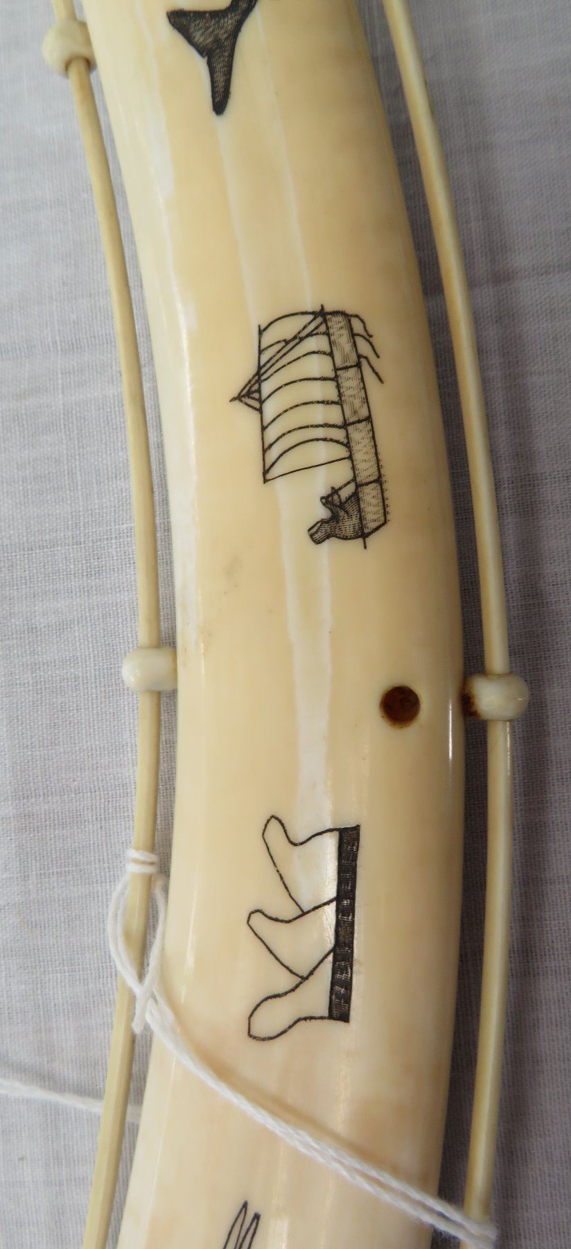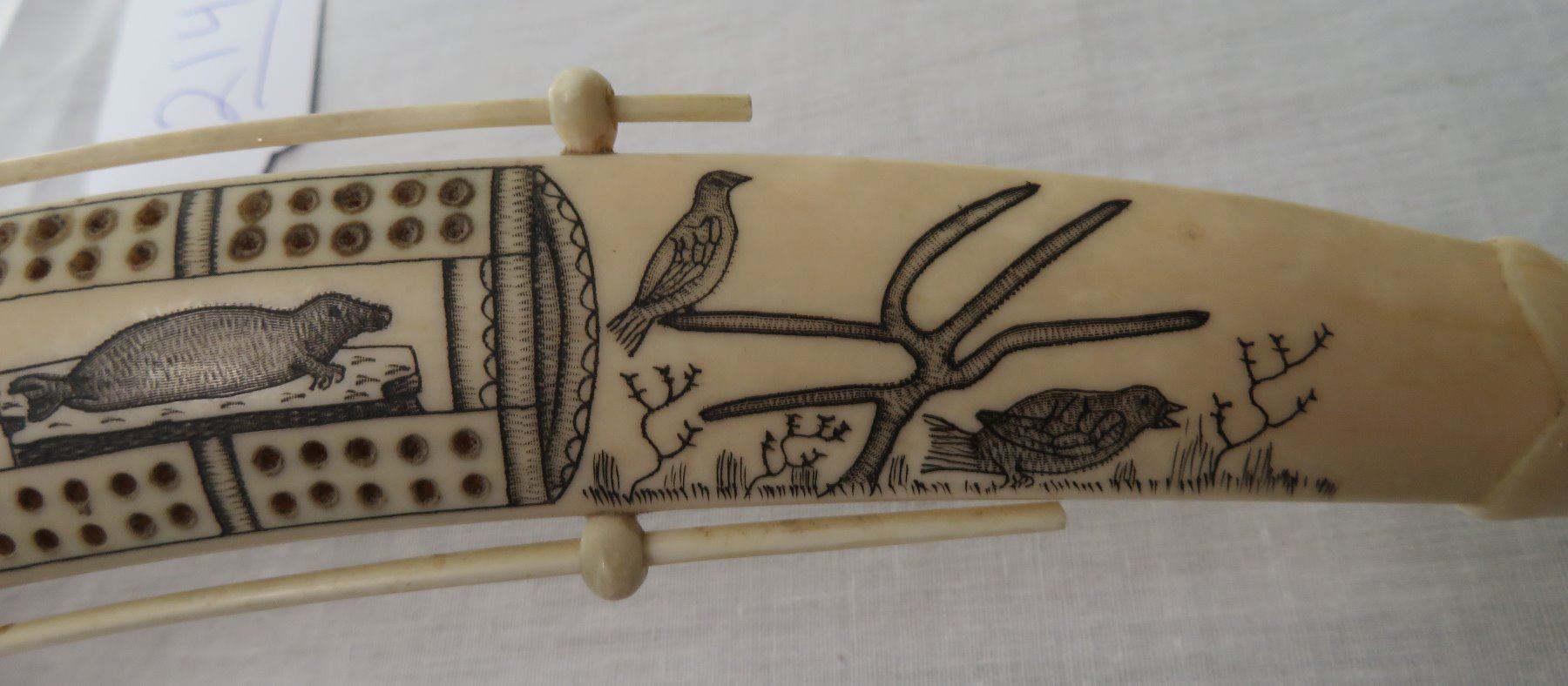 Eskimo Sculpture, c. 1940s. Made of bone, the item measures 2" x 15 1/2". Alaska. Scrimshaw on top and bottom. Condition: Good, see images. Shipping: $30.00 USA estimate only, w/insurance and signature, due to value and length.