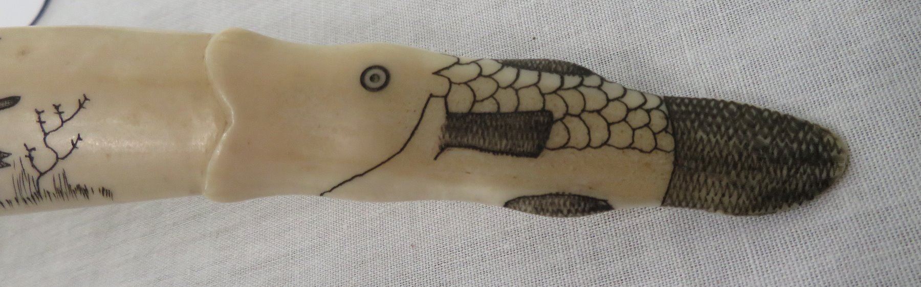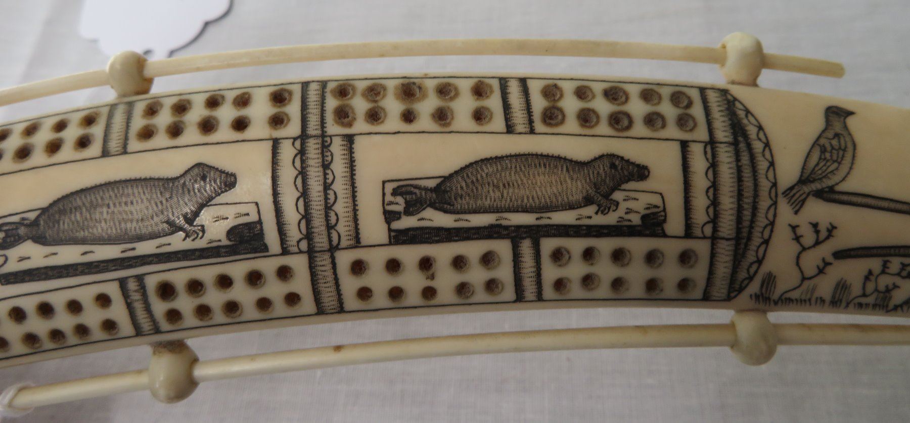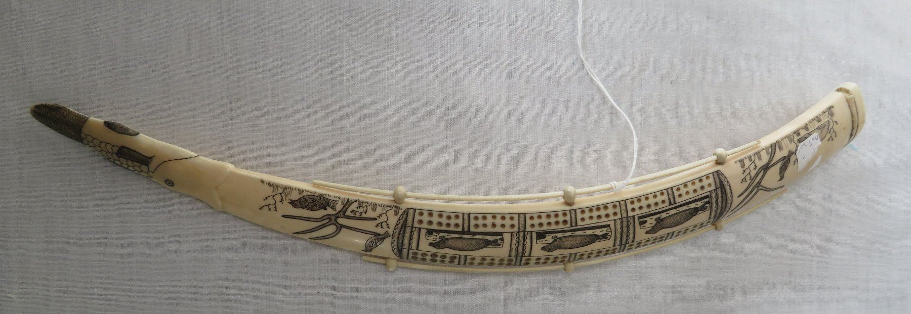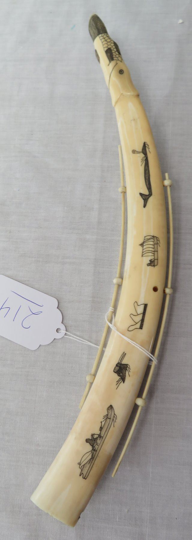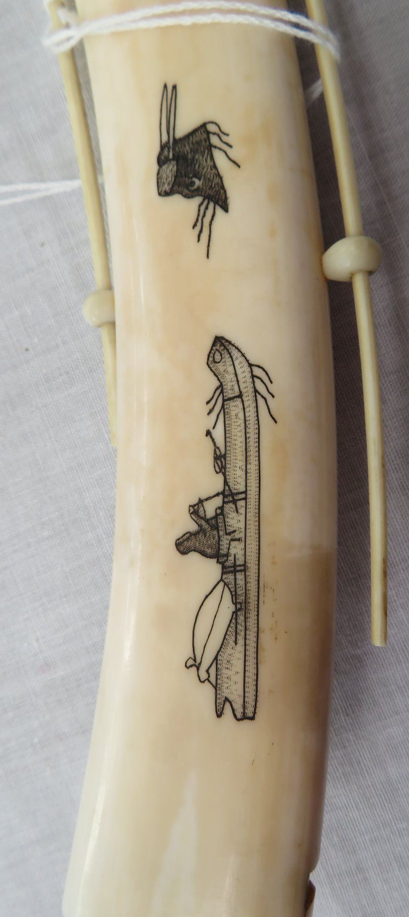 Eskimo Sculpture, c. 1940s. Made of bone, the item measures 2" x 15 1/2". Alaska. Scrimshaw on top and bottom. Condition: Good, see images. Shipping: $30.00 USA estimate only, w/insurance and signature, due to value and length.