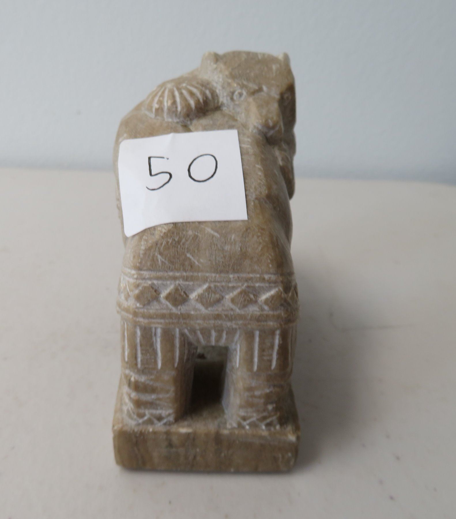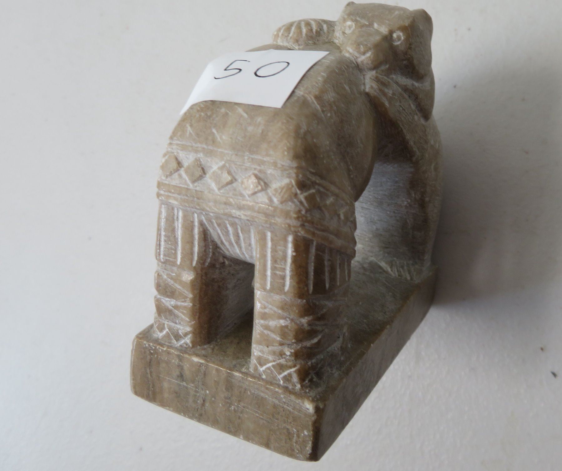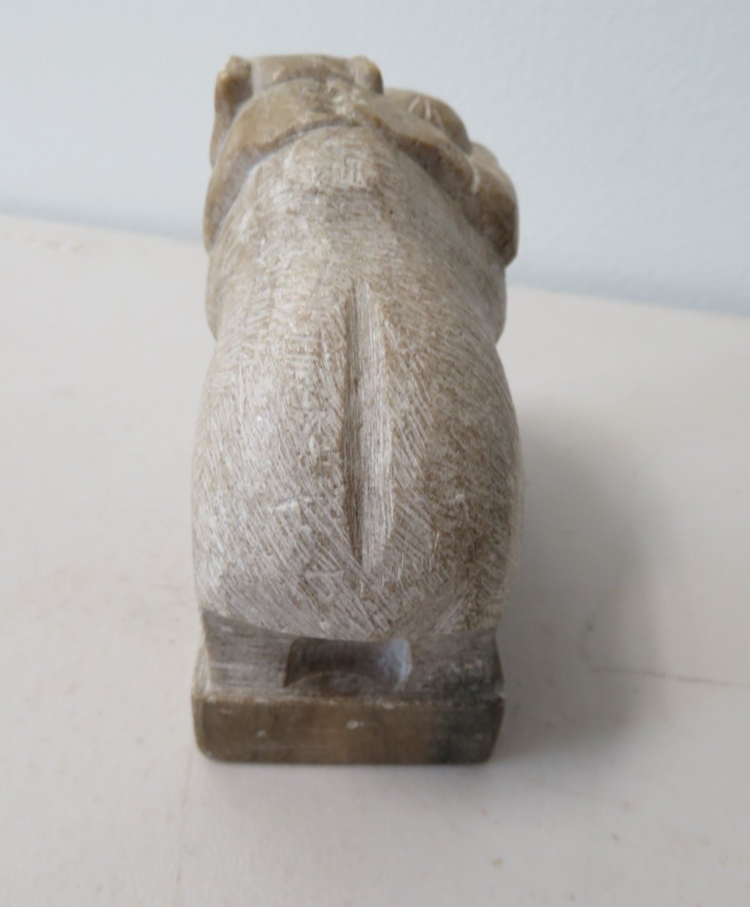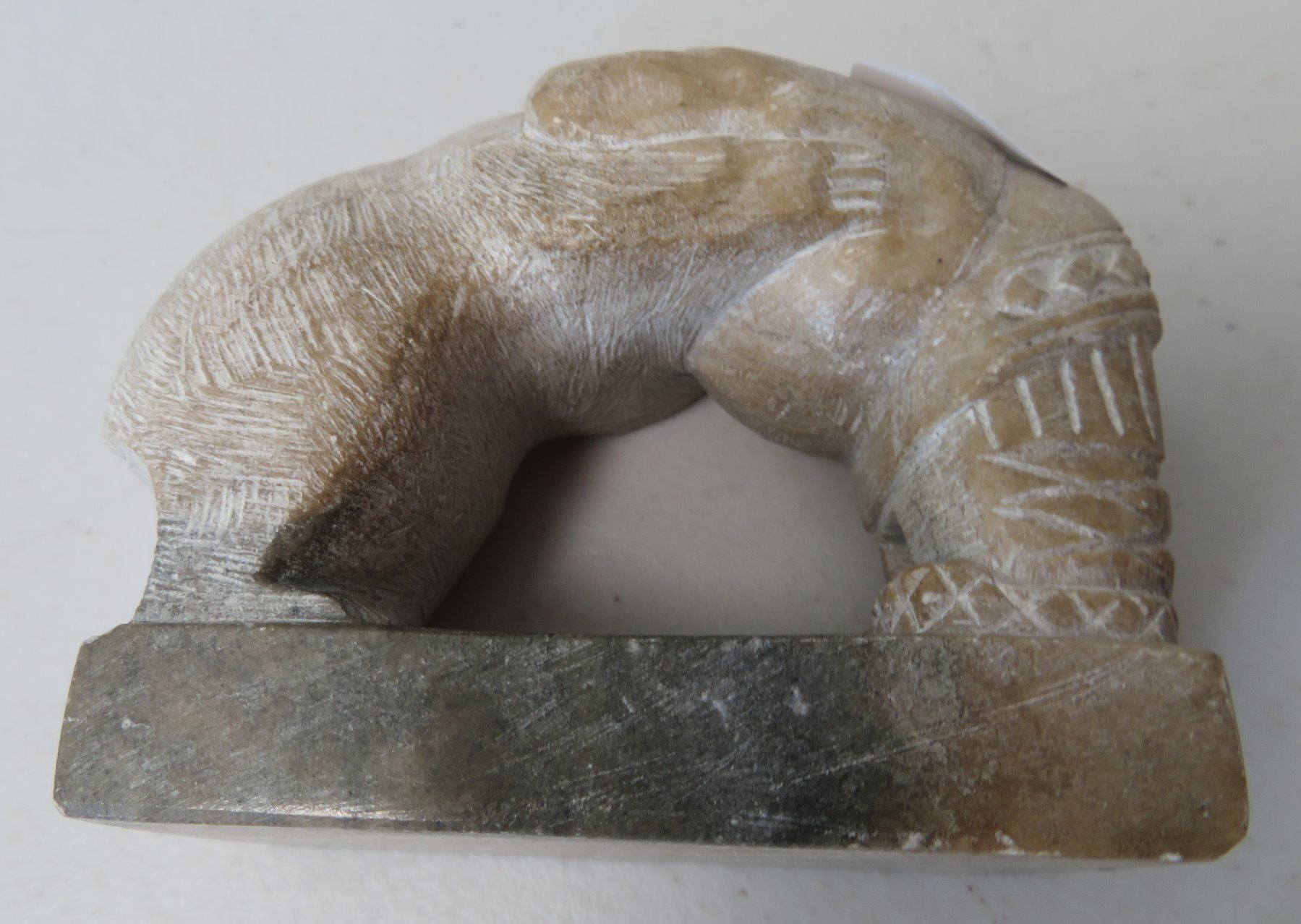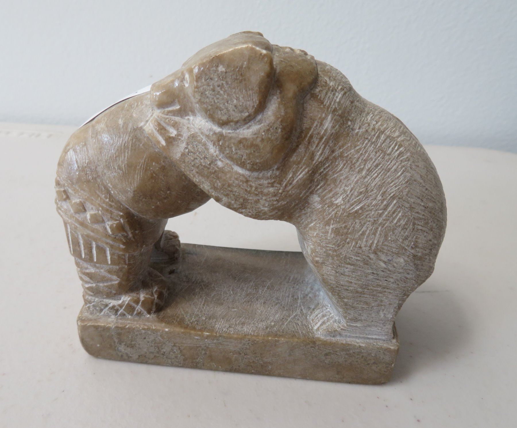 Eskimo Sculpture, c. 1970s. Made of steatite, the item measures 4 1/8" x 2" x 3 7/8". Alaska. Bear and Eskimo reciprocating hug. Condition: Good, see images. Shipping: $20.00 w/insurance and signature, due to weight.
