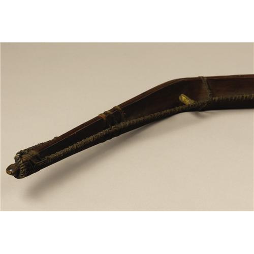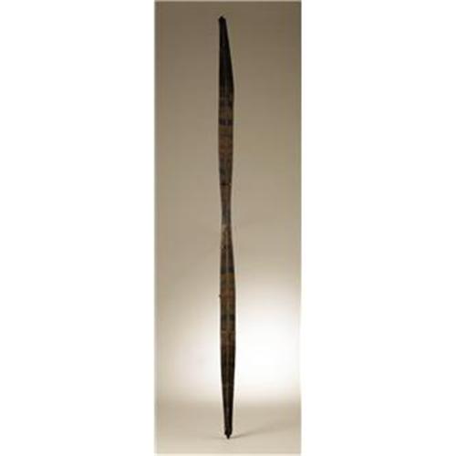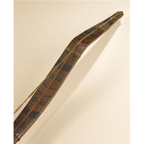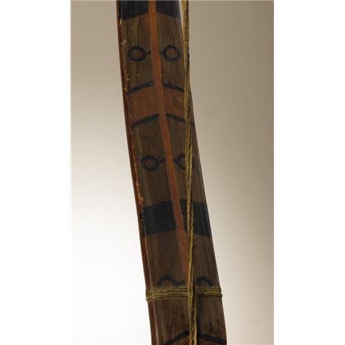 <B>Eskimo Sinew Backed Wood Bow</B></I><BR>Circa 1880<BR>Length 55 1/2 in.<BR><BR>The bow has elaborate sinew cable backing and two bone standoffs, all adding strength and elasticity, making it many times more powerful than an unreinforced wood bow. The bow is painted with an overall pattern of black circles framed by red and black horizontal bands against a lightly painted green background.<BR><BR> <BR><BR><B>Important notice: