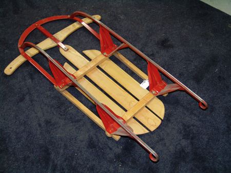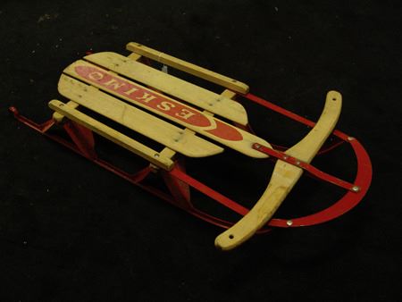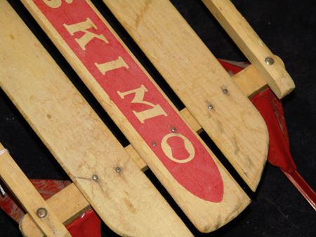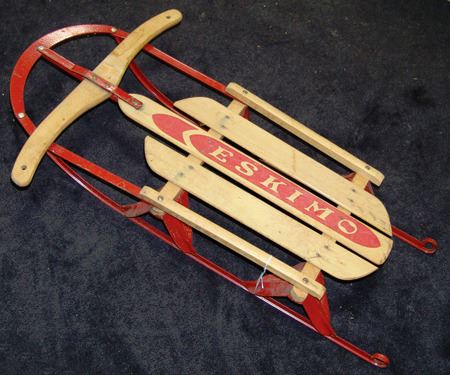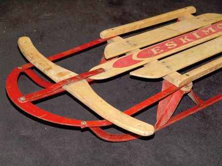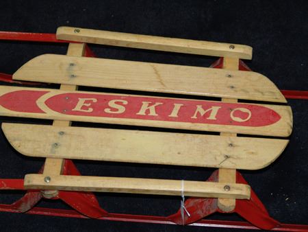 Mid 1900s, Traditional vintage child's runner sled made by Eskimo from wood and steel. In remarkably good condition, still has paint on the runners, usable. 37"