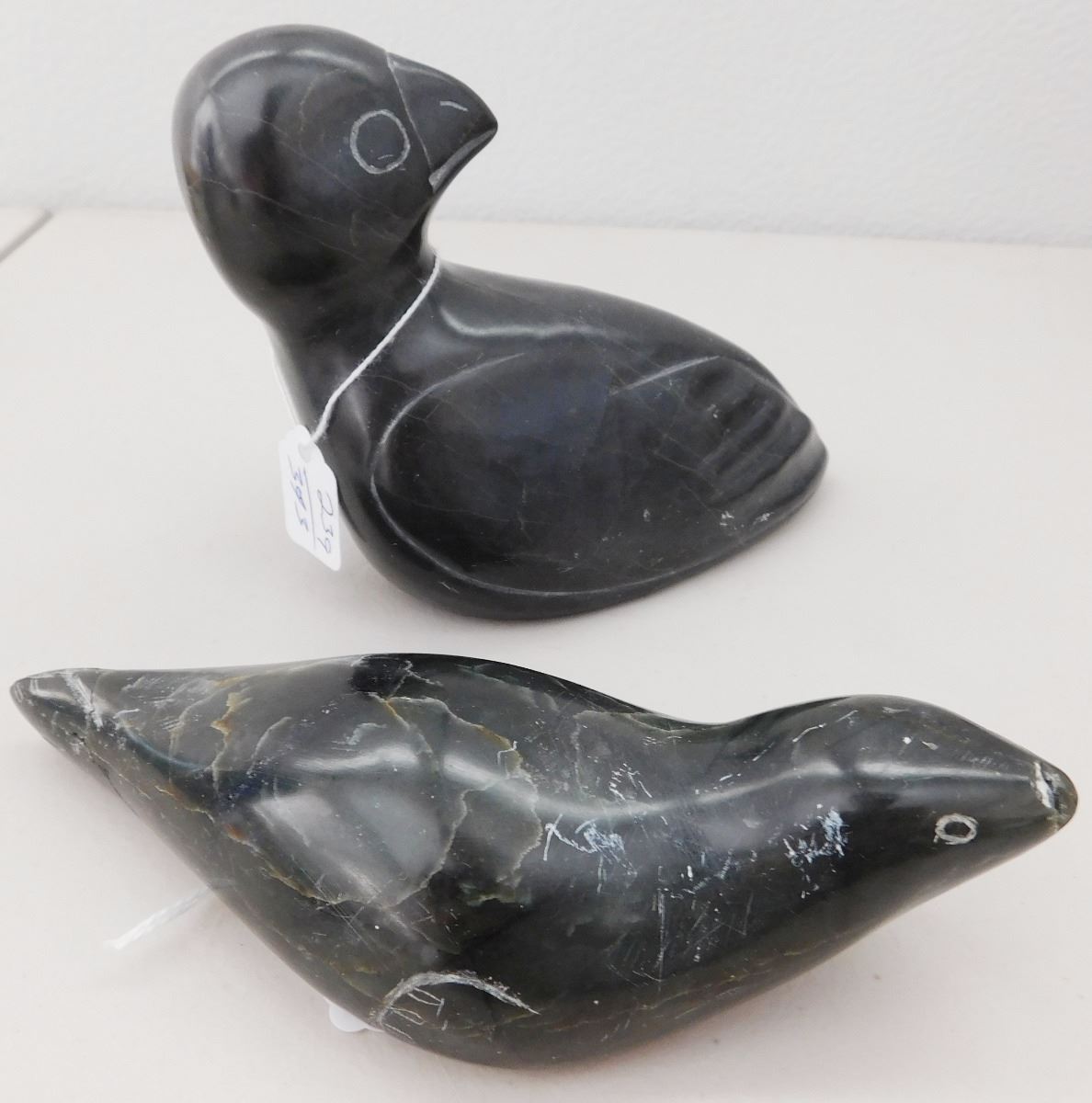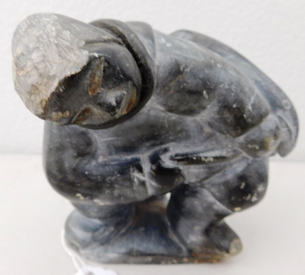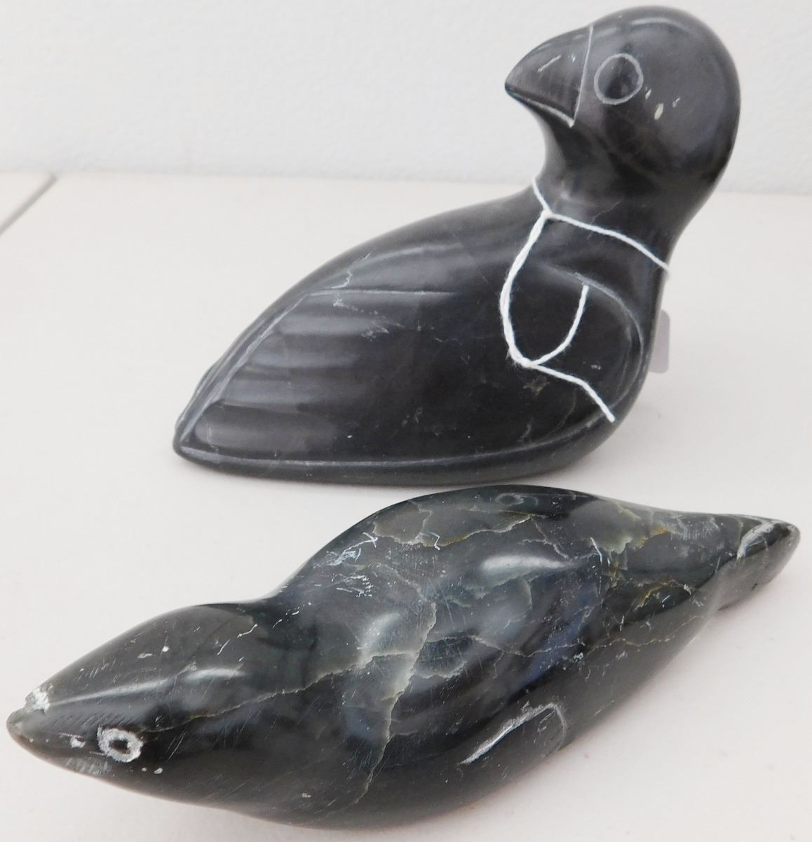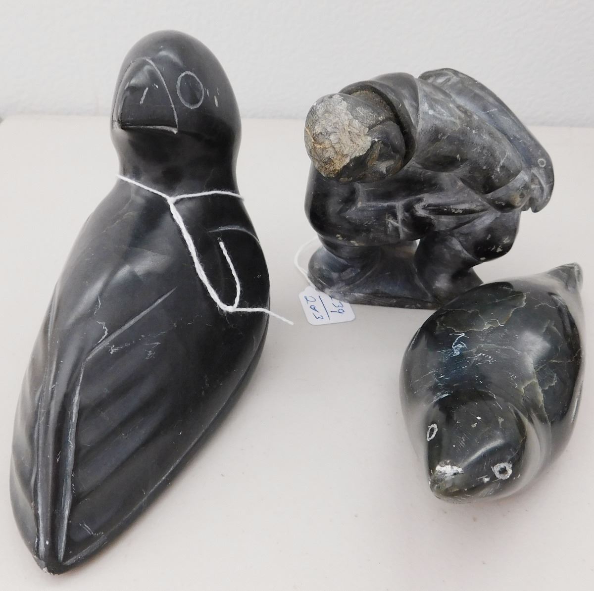 Eskimo Steatite Collection, circa 1960s. Made of steatite, green and black stone, items measure 4", 5" and 6.5". From Alaska. Large bird, fisherman with fish and a seal. Condition: Nicks and scratches, fisherman has chips on top of head, see images. Shipping: $30.00, requires double-box.