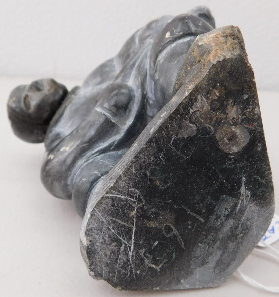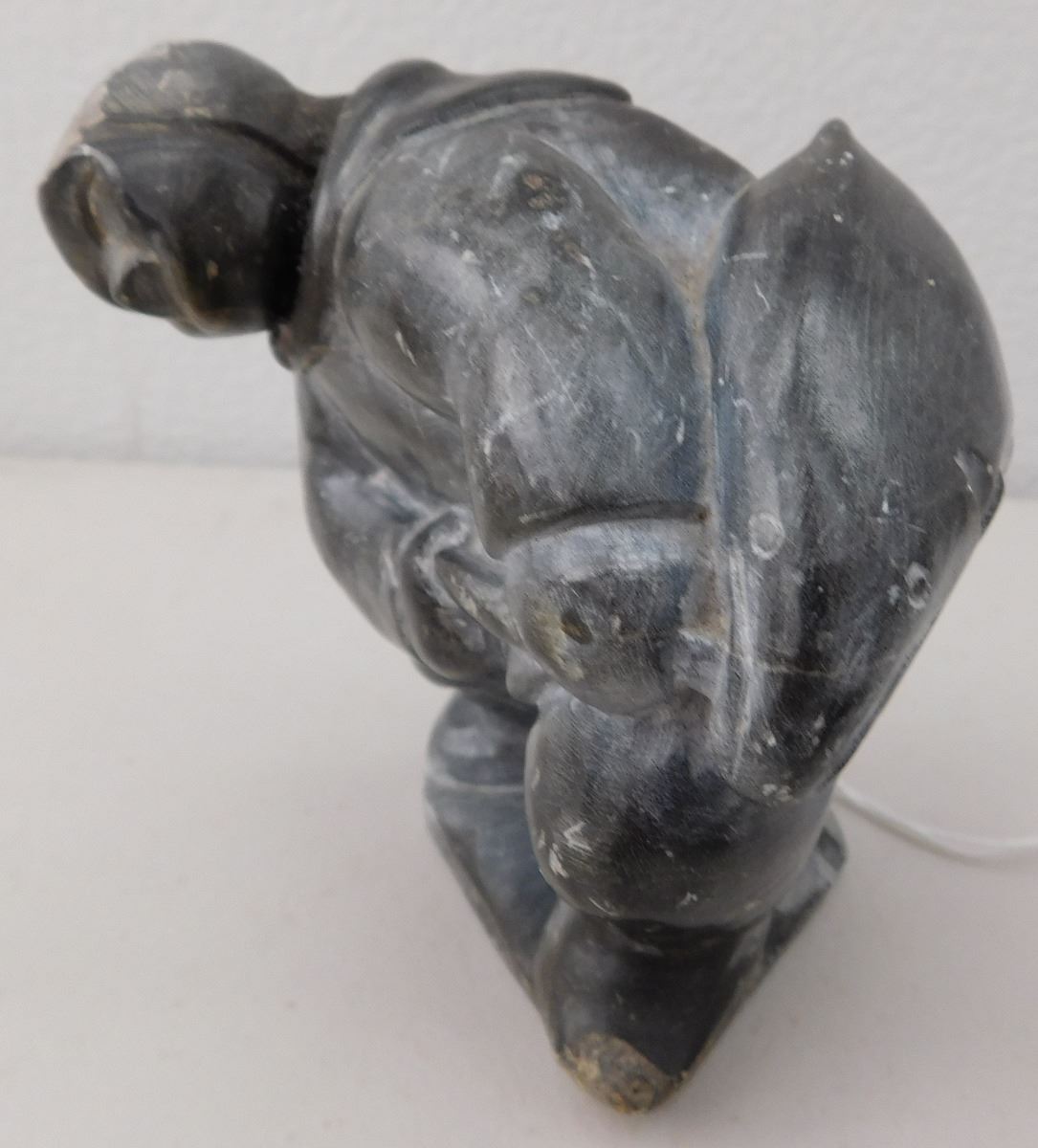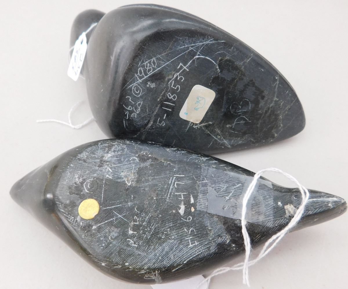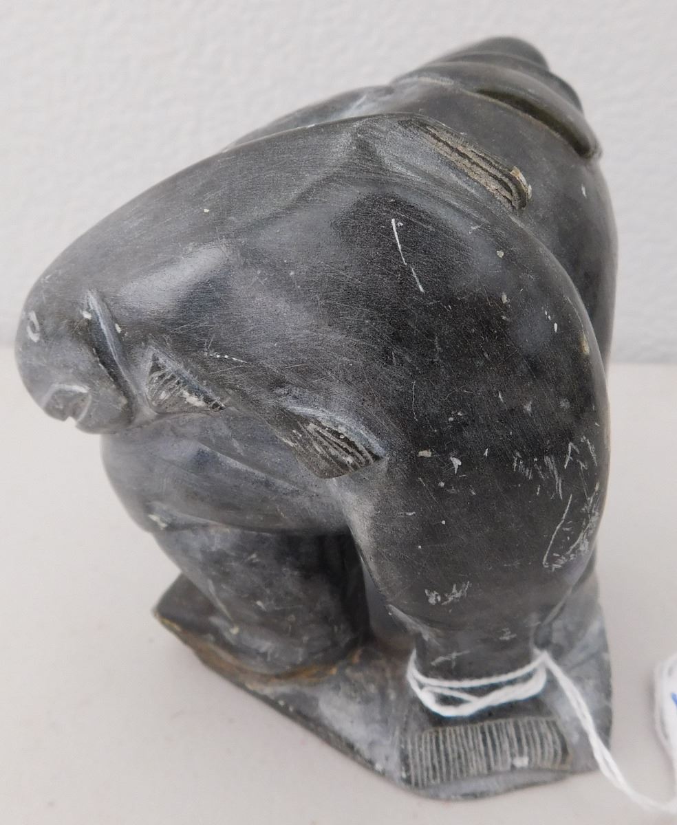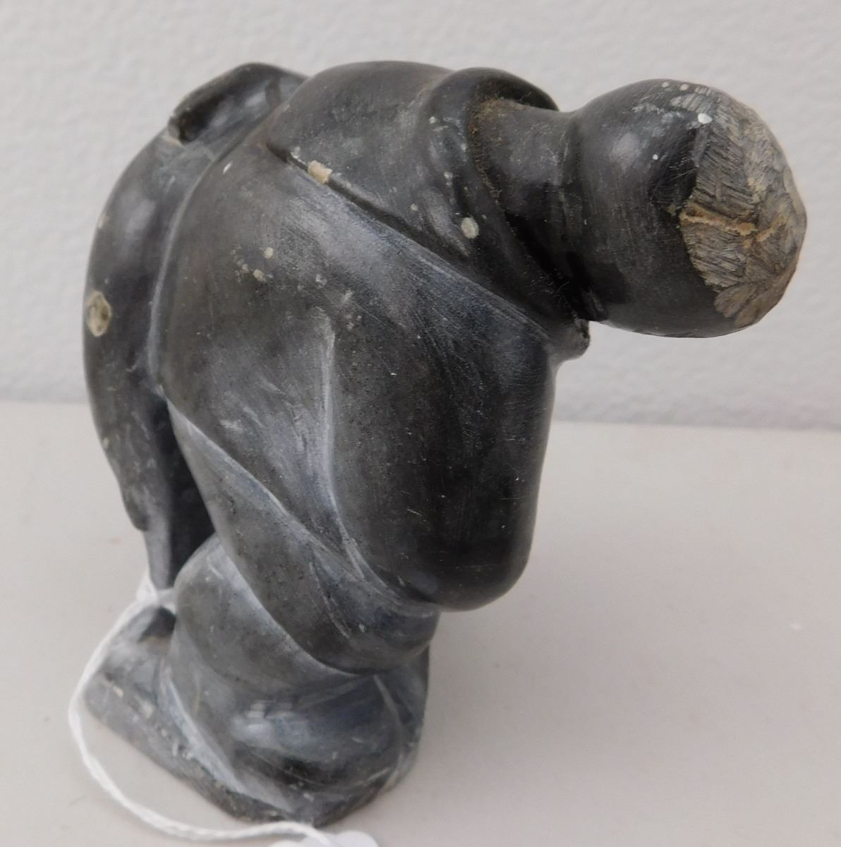 Eskimo Steatite Collection, circa 1960s. Made of steatite, green and black stone, items measure 4", 5" and 6.5". From Alaska. Large bird, fisherman with fish and a seal. Condition: Nicks and scratches, fisherman has chips on top of head, see images. Shipping: $30.00, requires double-box.