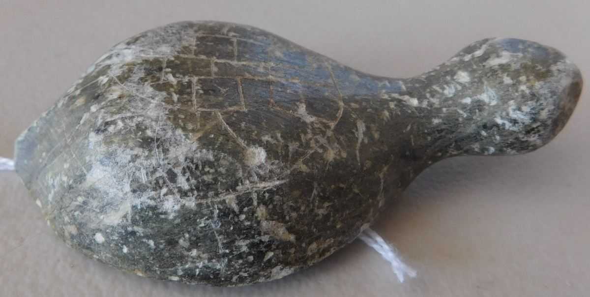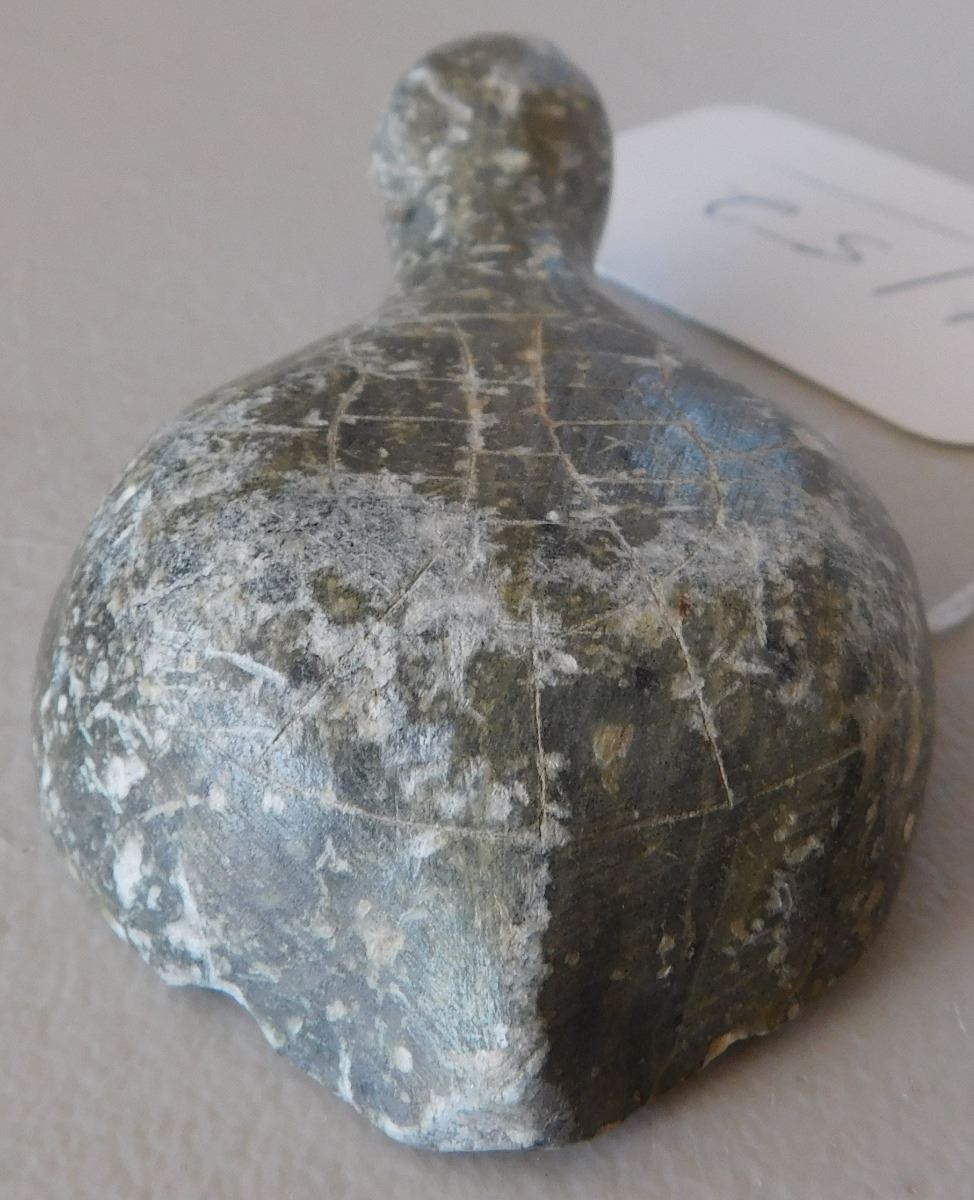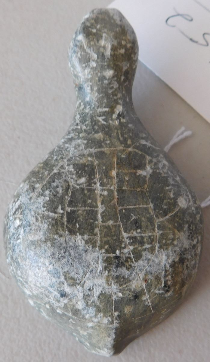 Eskimo Steatite Turtle, early historic period. Made of soapstone, this item measures 3" x 2" x 1". From near Sitka, Alaska. Has engraving on its back. Condition: Some scuffs from age, see images. Shipping: $18.50.