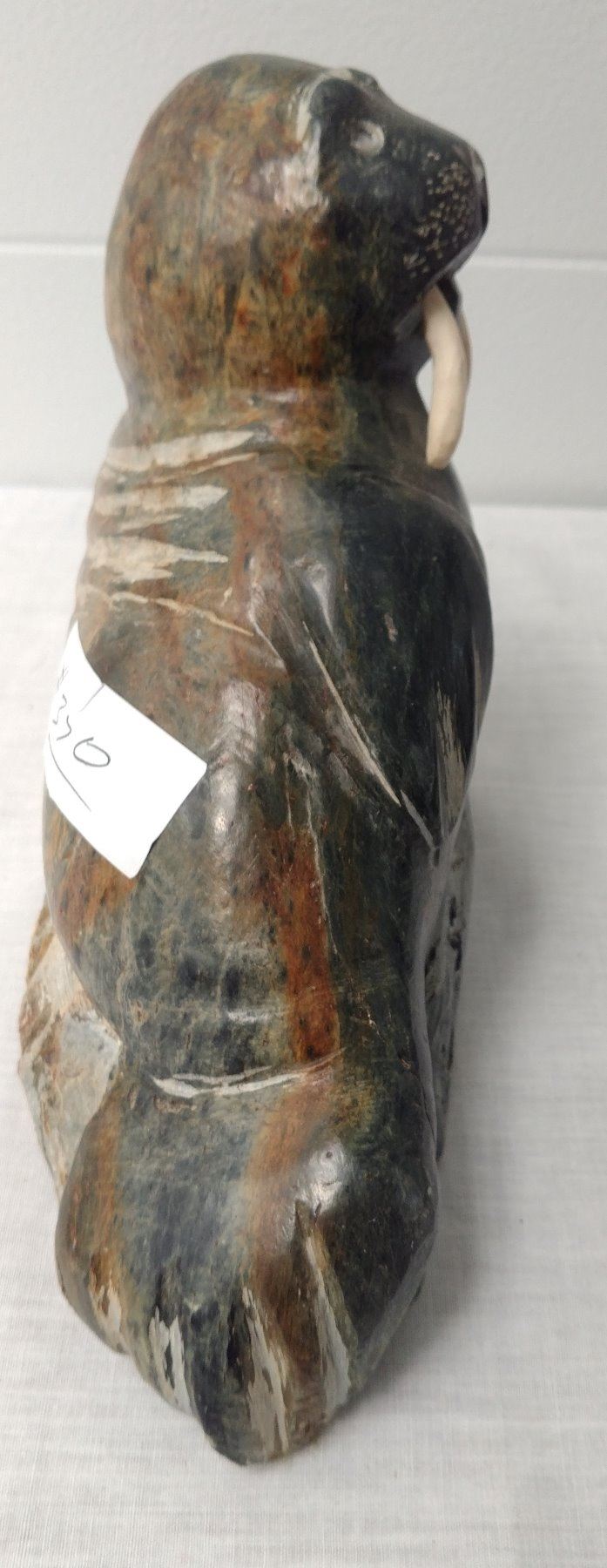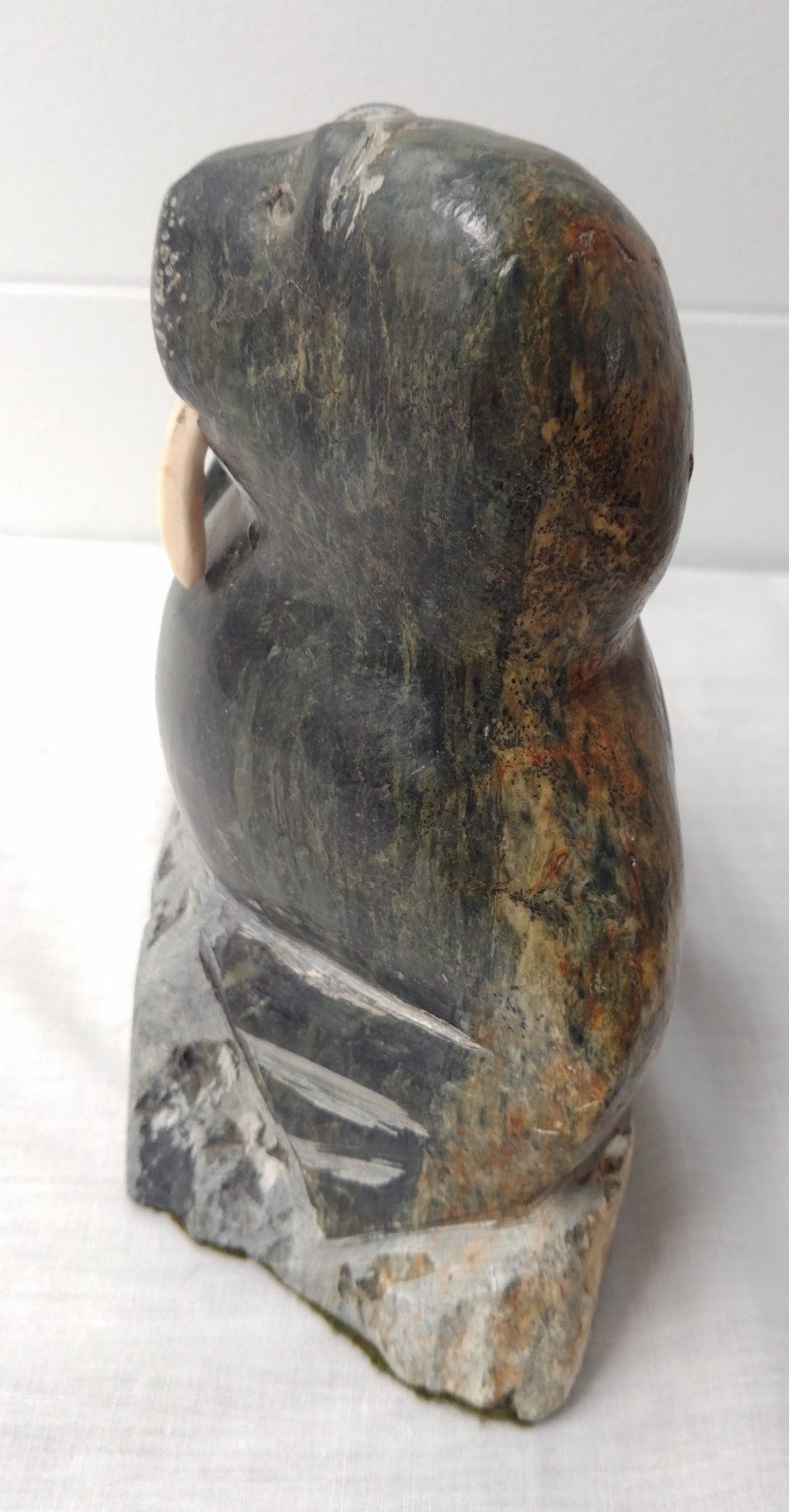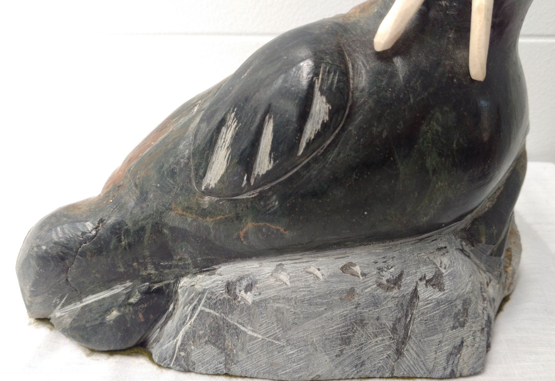 Eskimo Steatite Walrus, c. 1960s. Made of steatite and bone, the item measures 10" x 7" x 3". Alaska. Large and heavy sculpture. Condition: Good, see images. Shipping: $35.00 USA estimate only, w/insurance and signature, due to size and weight.