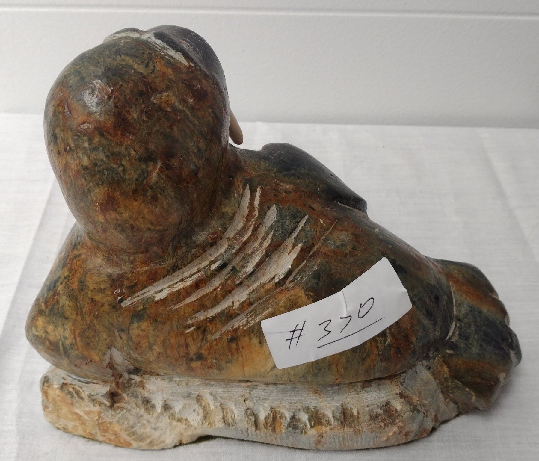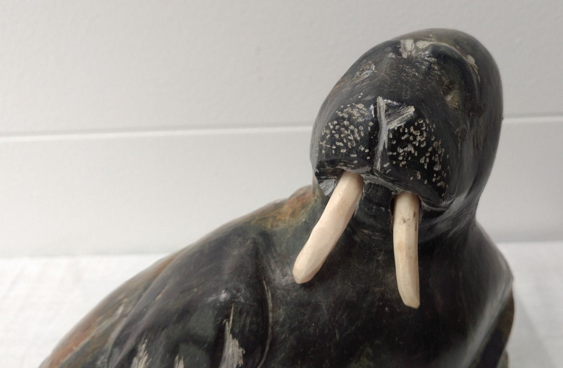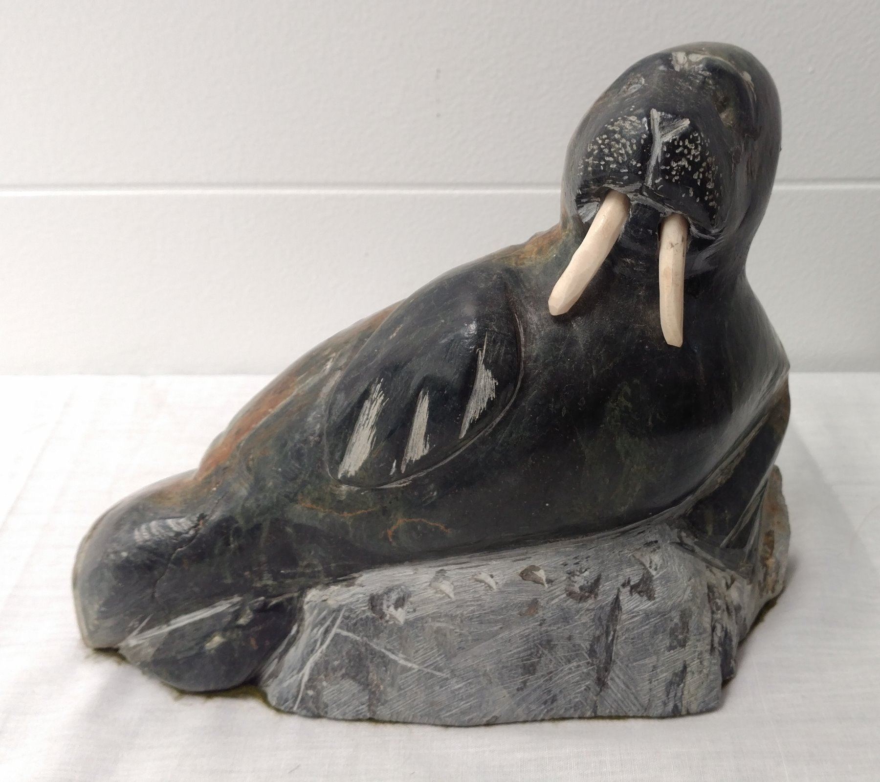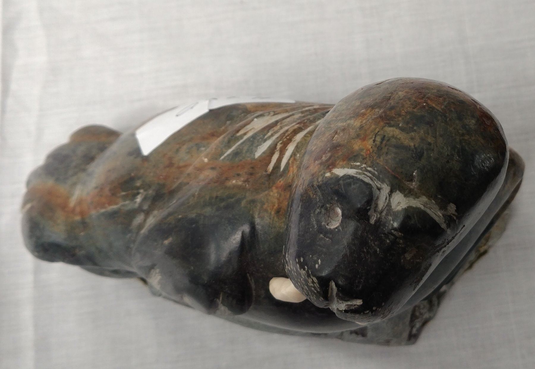Eskimo Steatite Walrus, c. 1960s. Made of steatite and bone, the item measures 10" x 7" x 3". Alaska. Large and heavy sculpture. Condition: Good, see images. Shipping: $35.00 USA estimate only, w/insurance and signature, due to size and weight.
