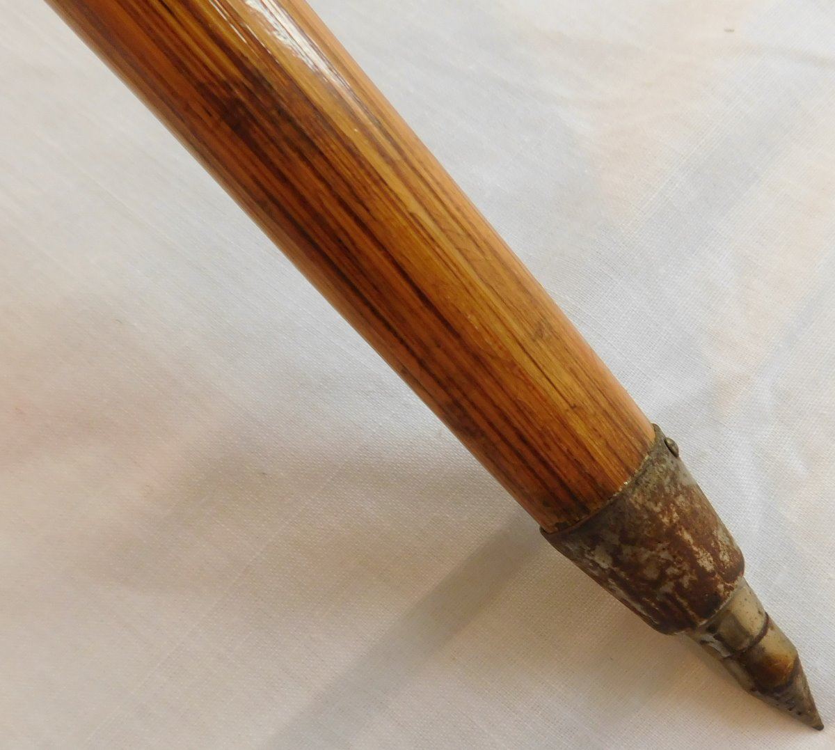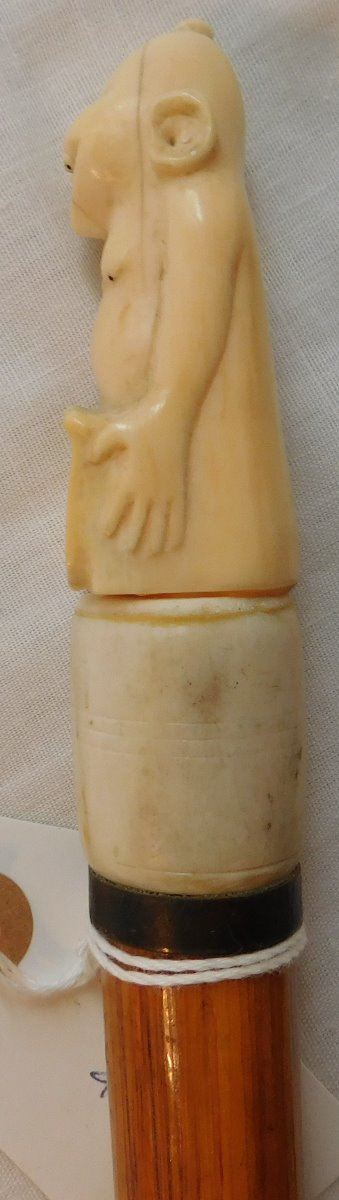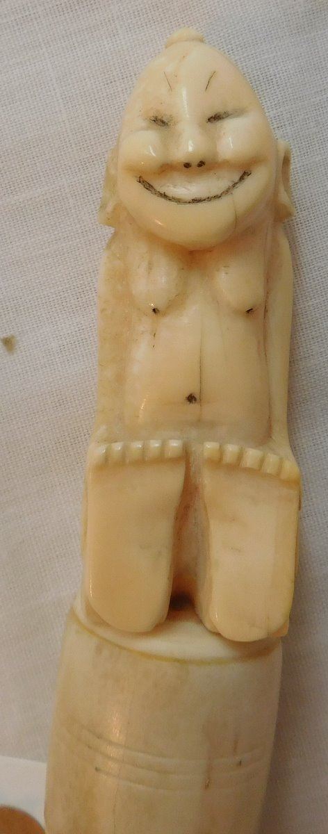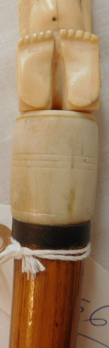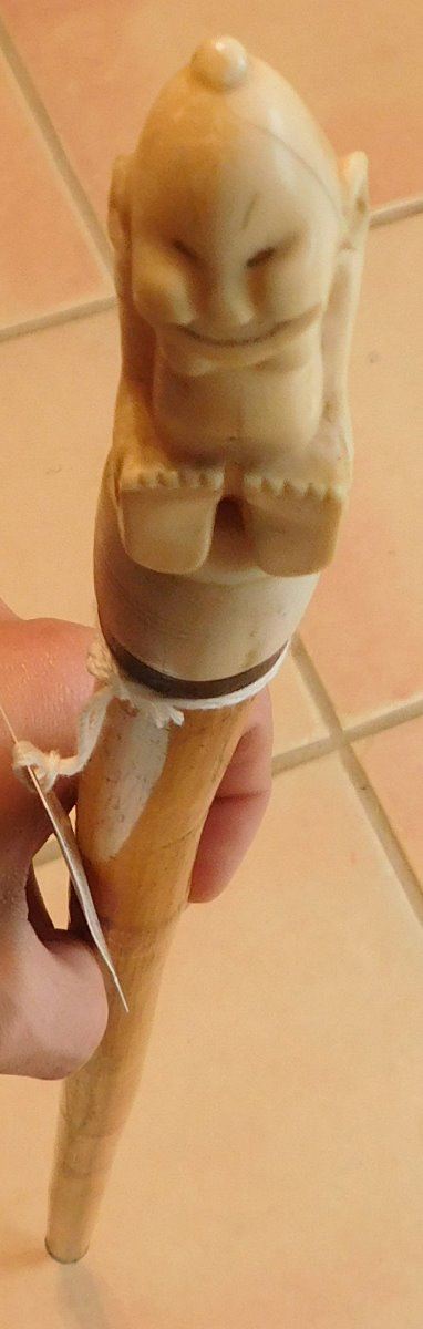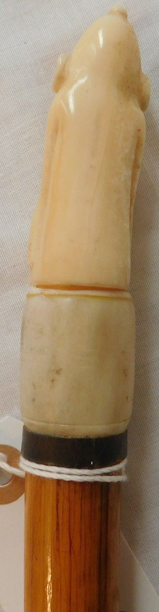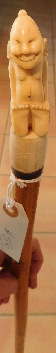 Eskimo Walking Cane, circa 1900. Made of wood and bone, the item is 37.5" long, billiken carving is 2.75" tall. Nice billiken effigy. Condition: Good, see images. Shipping: $32.00 USA estimate only, due to length, w/insurance and signature.