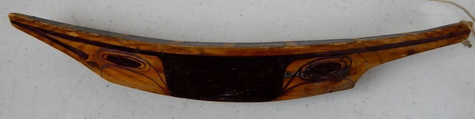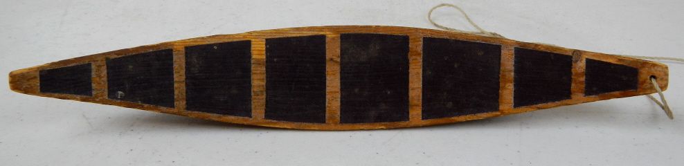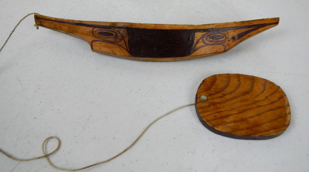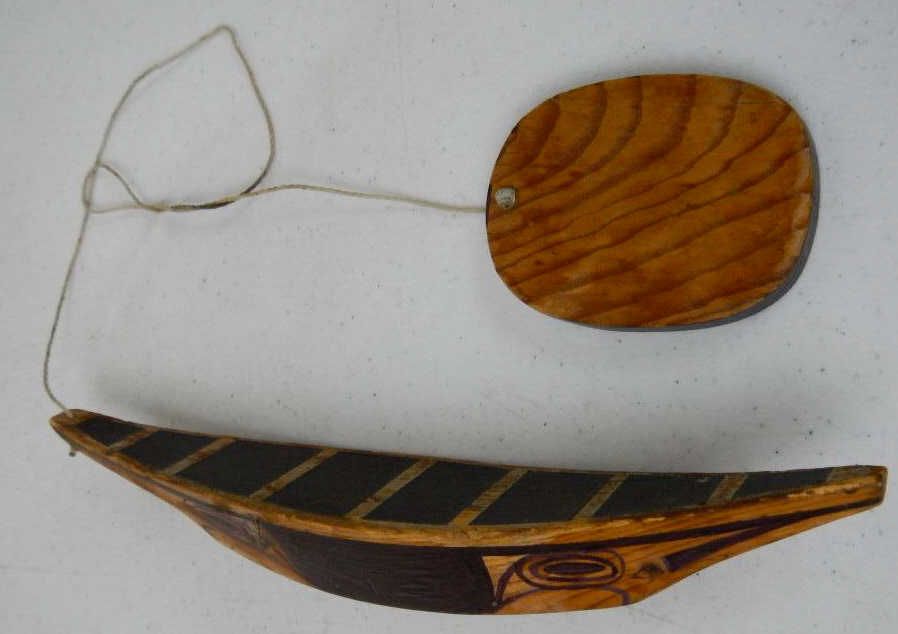 Eskimo Wooden Boat Toy - This is hand made by the Eskimo Native Americans. This is a boat pull along toy with string itact that fatures, hand painted top and sides with Eskimo Designs and a wood boat conected by string to the handle from circa mid to late 1900's. The Boat measures 9.25" the handle measures 3 1/8" and total length of toy is 32" long.