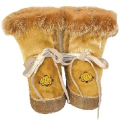 Eskimo men's mukluks, multi-colored beaded sealskin w/Arctic rabbit fur trim, Exc. condition w/very