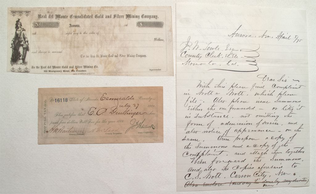 3 pieces. Letter of Complaint filed with Mono County in 1875; 1882 Poll Tax receipt for E. C. Drulfinfer (sp); Real del Monte Consolidated Gold and Silver Mining Company blank check. (Ames Collection)