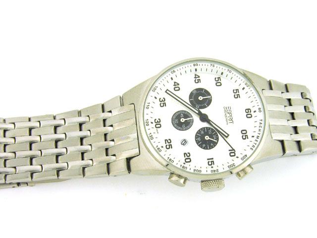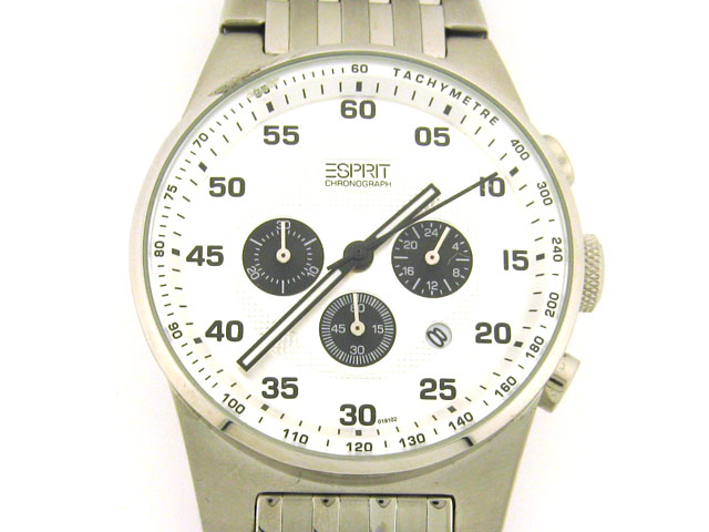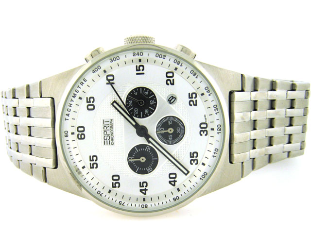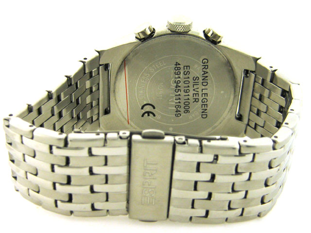 This is an Esprit Gents Chrono Grand Legend SILVER A.ES101911006 with the following features: Chronograph function; Stainless steel case; Stainless steel strap with Folding clasp with a Esprit logo; Silver colored with a Esprit logo; Black, lightning / B