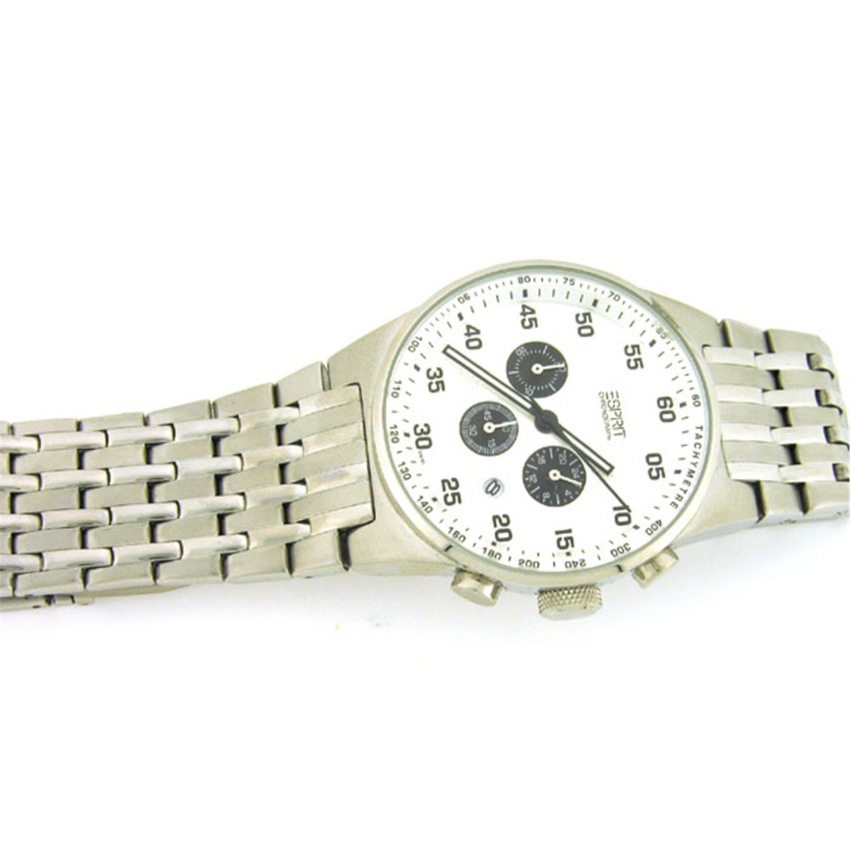 This is an Esprit Gents Chrono Grand Legend SILVER A.ES101911006 with the following features: Chronograph function; Stainless steel case; Stainless steel strap with Folding clasp with a Esprit logo; Silver colored with a Esprit logo; Black, lightning / Black, white; Precise Quartz Movement; Mineral glass; 44 mm Case Diameter; 10.5 mm Case Thickness; and Water Resistant.