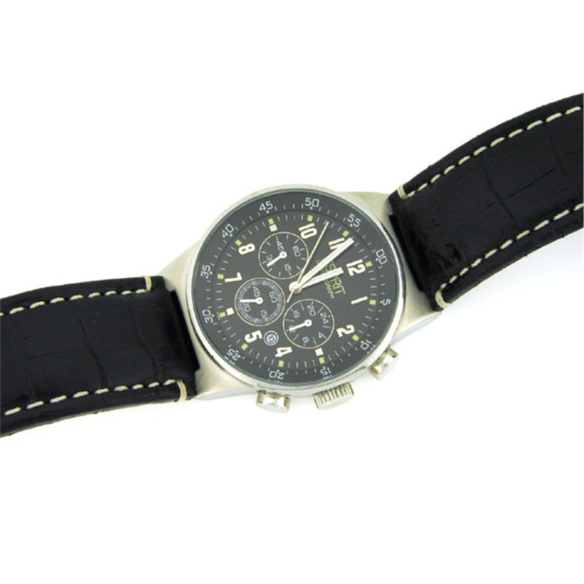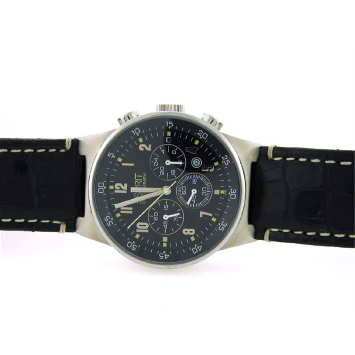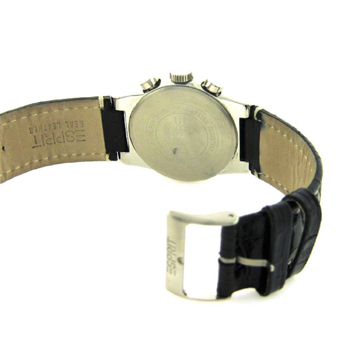 This is an Esprit Mens Chronograph Leather Watch with the following features: Black dial; Stainless steel case; Black leather strap; Chronograph function; Quartz movement; and Water resistant
