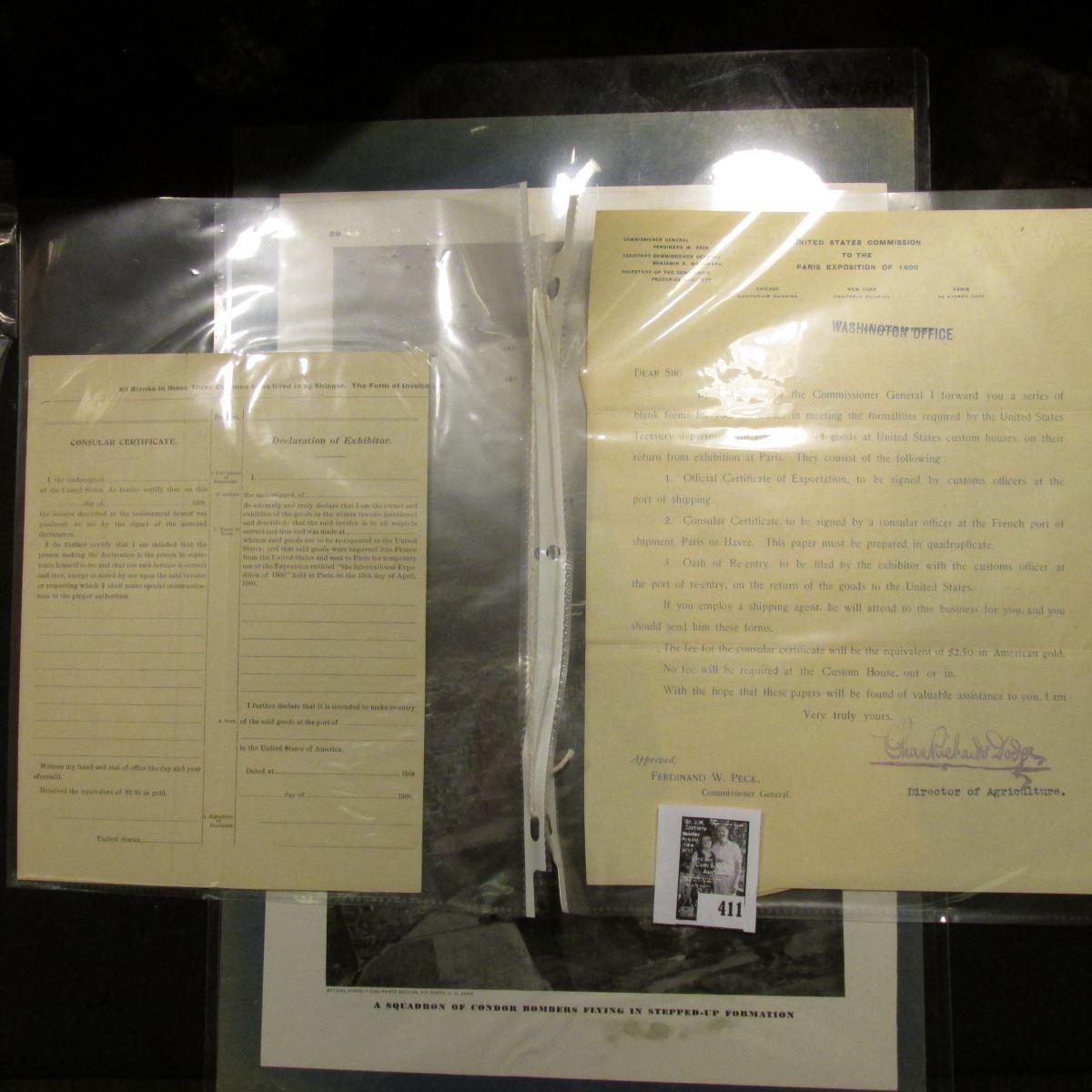 Esquire poster "A Squadron of Condor Bombers Flying in Stepped-Up Formation"; & a letter from the "United States Commission to the Paris Exposition of 1900".