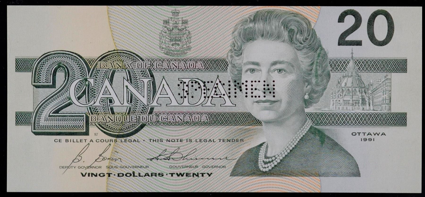 Essay Note; 1991 $20 BC-58b - Polymer DuraNote Specimen (Punched) example w/Full Print. UNC example.