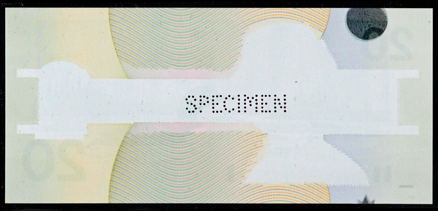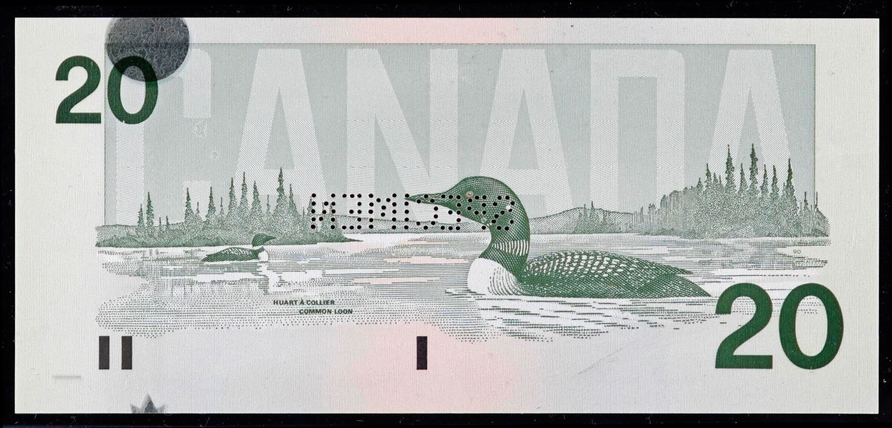 Essay Note; 1991 $20 BC-58b - Polymer DuraNote Specimen (Punched) example w/No Window (Face) Print. Shows partial Maple Leaf & O on top.