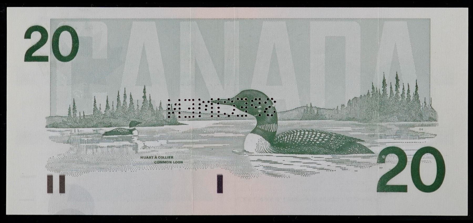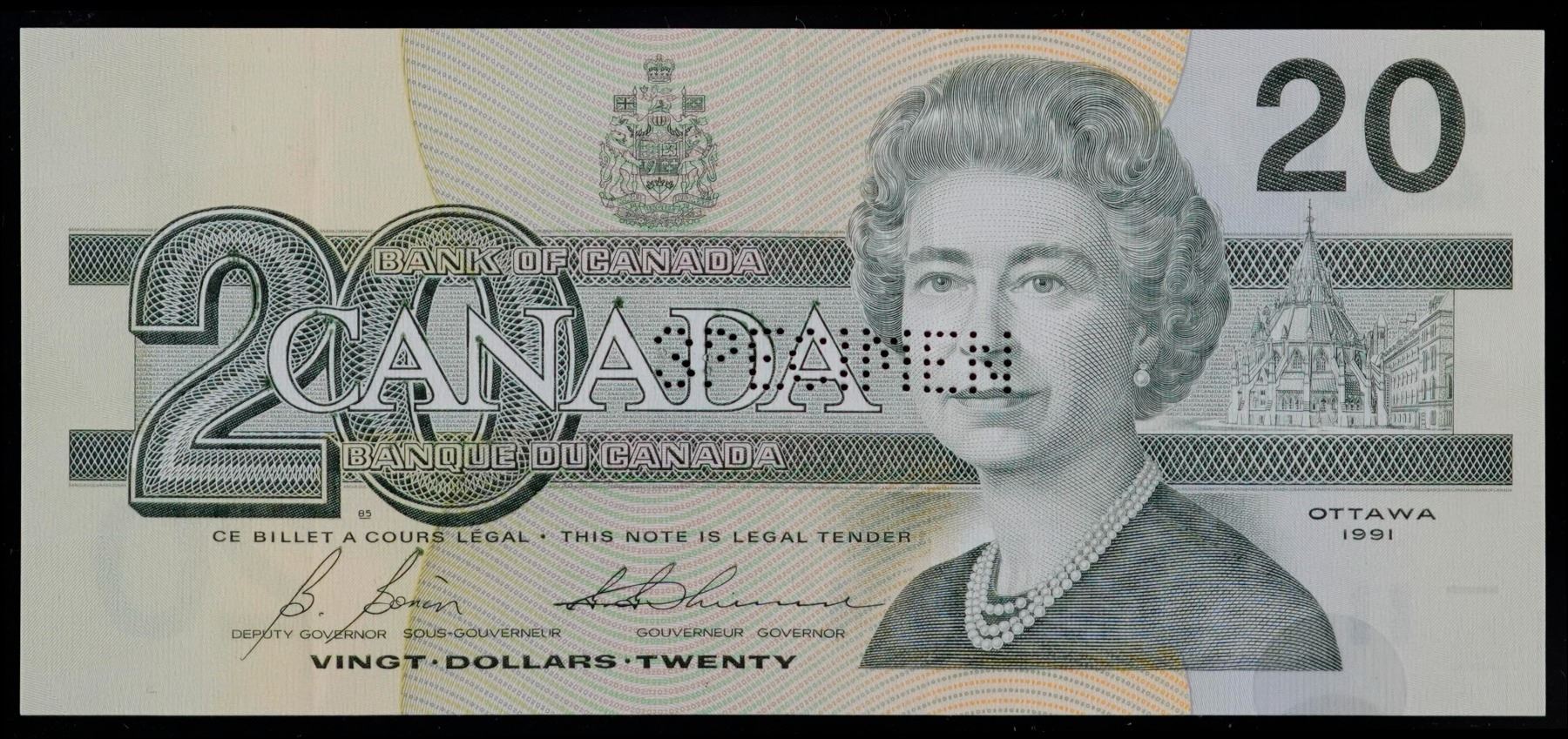Essay Note; 1991 $20 BC-58b - Polymer DuraNote Specimen (Punched) example w/o Full Print. EF example.