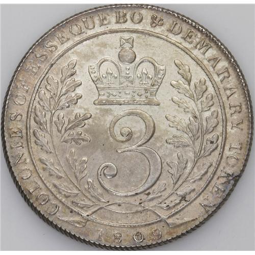<B>Essequibo & Demerary 3 Guilder 1809,</B></I> Bust right/Crown over 3, KM8, AU-UNC with small planchet laminations. The strike is bold for this type and the color is a pleasing lilac and gray.<BR><I>From the St. Petersburg Collection.</B></I>