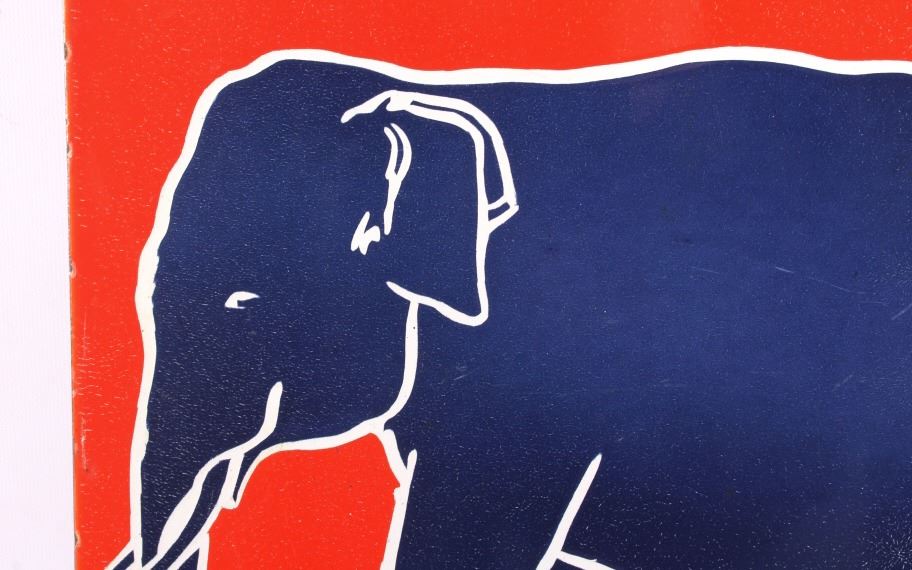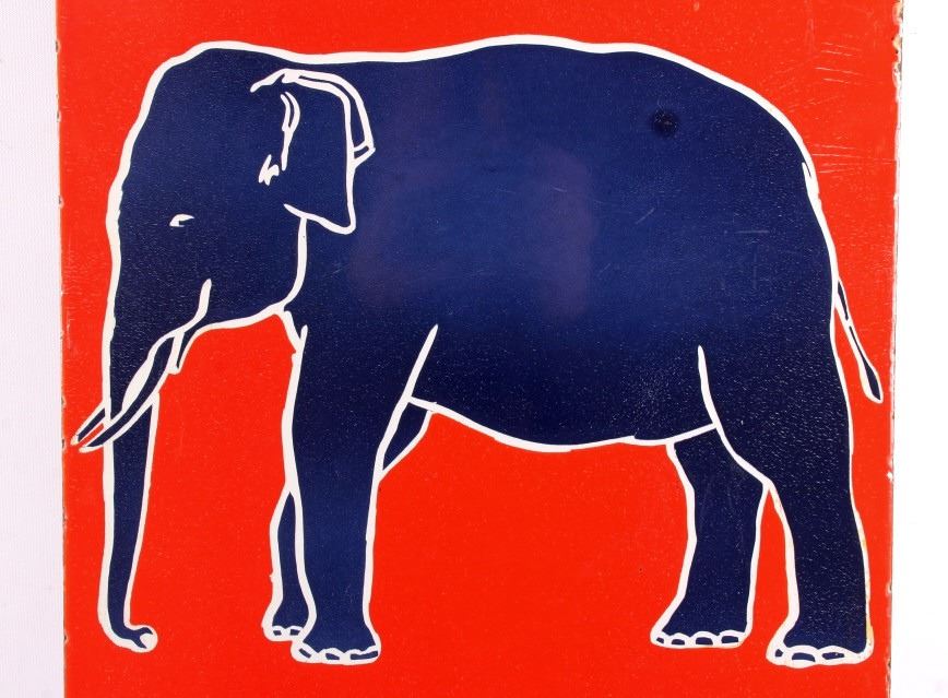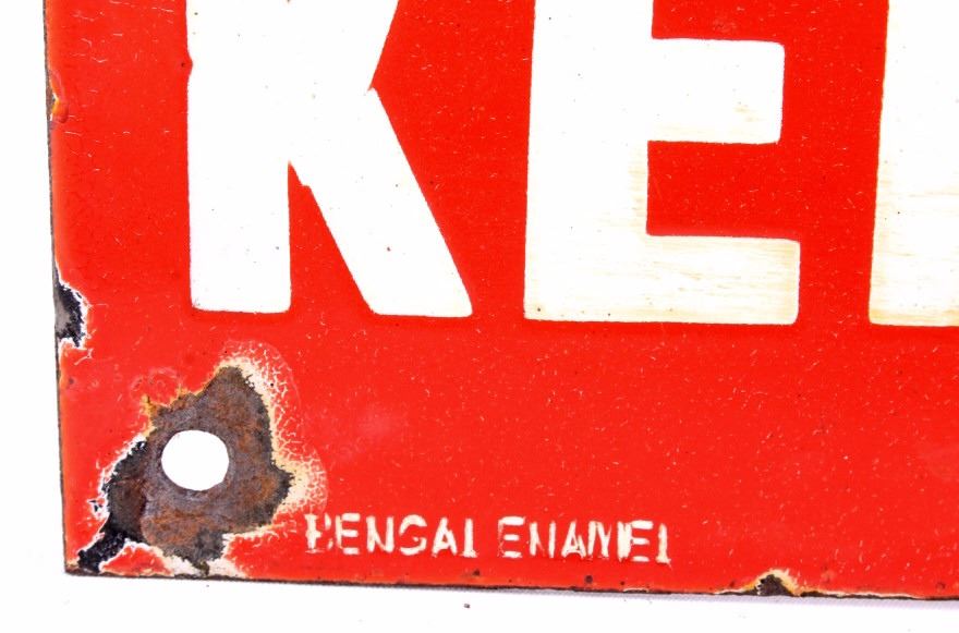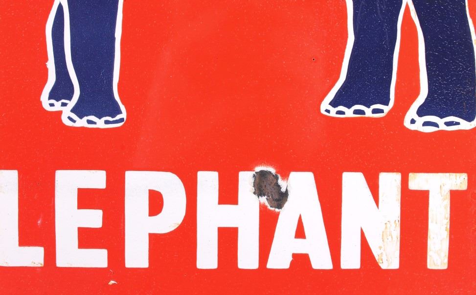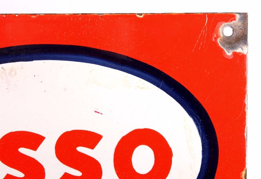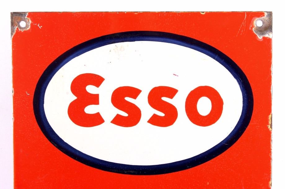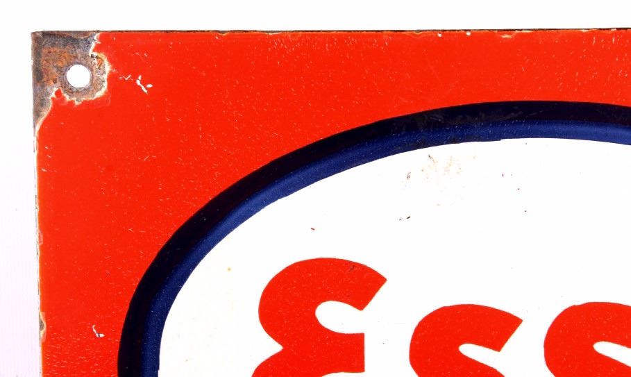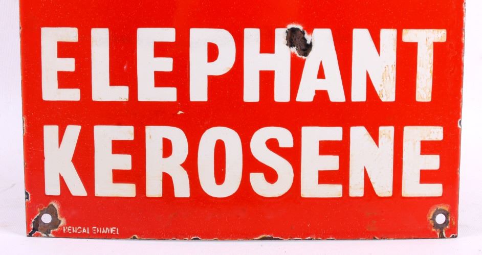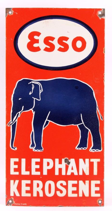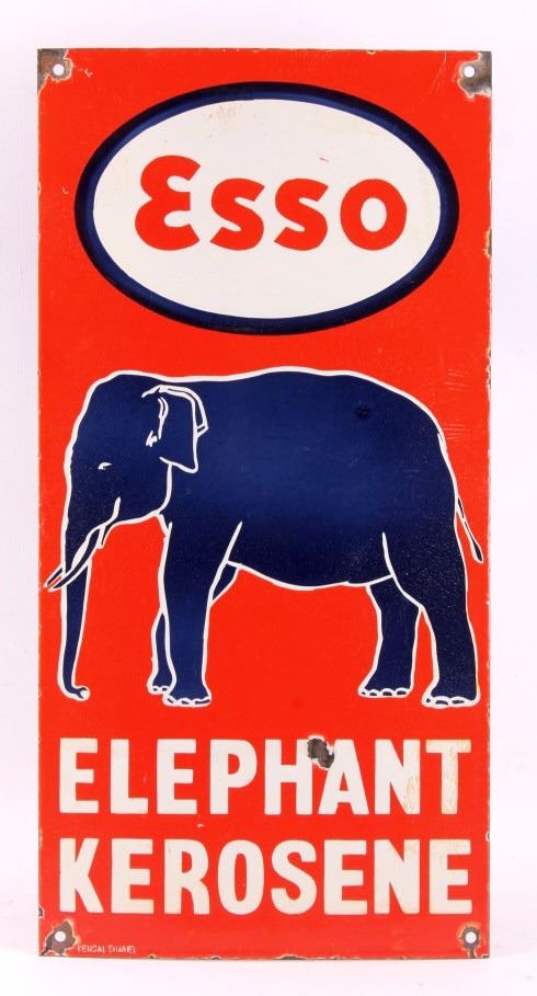 This is an Esso Elephant Kerosene porcelain sign. The sign shows the Esso oval logo with the elephant image and reads "Elephant Kerosene". The bottom left corner of the sign is marked "Bengal Enamel". The Esso sign is in good overall condition. The edges and mounting holes have chipping as shown. The sign measures 12" x 24". Please review the pictures for condition and description correctness.