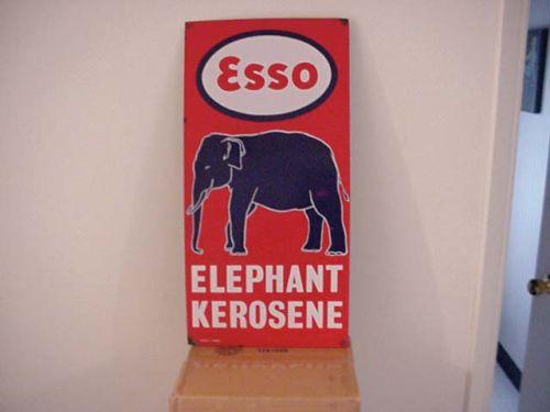 Esso Elephant porcelain kerosene sign, single sided, all grommets intact except one, slight edge chips. 12" x 24" Ex. cond.
