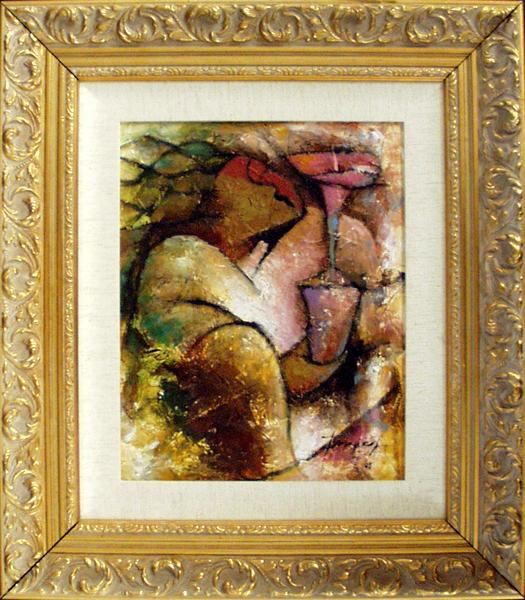 Artist: Essud Fungcap Title: Flower to YouMedium: Oil on board, framedDate: 2005Full size: 25 1/2 x 22 1/2 inchesImage size: 16 x 12 1/2 inchesBiographyEssud paints to excite, to calm, to stir emotion with a sensitivity to color and form influenced by a lifetime in the Caribbean. He acknowledges the contributions that a bicultural upbringing, a Chinese father and a Haitian mother, have made to his sense of wonder of the world around him. He is constantly striving to inject aspects of surealism in his work and at the same time convey a certain quiet, peaceful tropical style that reinforces our sense of "being there". Essud believes that critical study of color and form for each individual work are essential, and consequently his work always undergoes several transformations before reaching the point where he feels that it is ready for presentation. Music is an integral part of Essud's life and he finds many parallels in the works of great Latin, jazz and classical composers as he searchesfor the natural rhythm of his own work. To that end, he sees himself as a composer of sorts, bringing together different mediums, ideasand emotions to create harmony and bring "life" to his paintings. In his own words, "A life without art would bring despair, but art withoutthe life it seeks to represent would be unbearable." Received from: http://www.thecollectionshop.mobi/xq/ASP/Artist.Essud_Fungcap/qx/artist_profile.htm