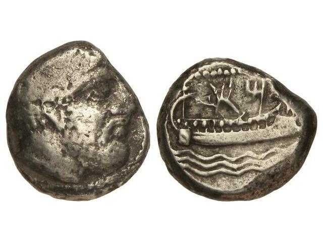 Estátera. - 350-332 a.C. - ARADOS. - Anv.: Deidad laureada a derecha. Rev.: Galera a derecha. 10,10 grs. AR. Se-5977. MBC-/MBC. - -