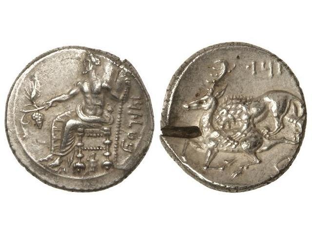 Estátera. 361-334 a.C. TARSOS. MAZAIOS. Anv.: Baal sentado a izquierda sosteniendo racimo de vid, detrás leyenda. Rev.: León atacando ciervo, encima leyenda. 11 grs. AR. (Golpe de cizalla). Se-5649. EBC-.