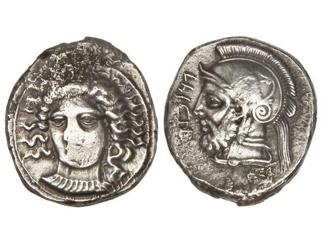 Estátera. 379-374 a.C. FARNABACE. TARSOS. CILICIA. Anv.: Cabeza de Aretusa de frente. Rev.: Cabeza barbada con casco a izquierda. Leyenda fenicia. 10,20 grs. AR. CY-2974; Se-5639. MBC/MBC+.