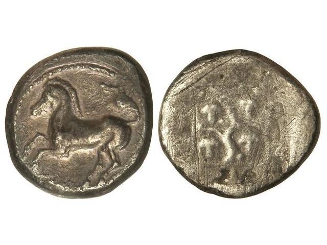 Estátera. - 385-360 a.C. - MARONEIA. - TRACIA. - Anv.: Caballo corriendo a izquierda. Rev.: En cuadro incuso cuatro racimos de uvas, alrededor leyenda. 11,90 grs. AR. (Rayas). Se-1631 var. MBC/BC-. - -