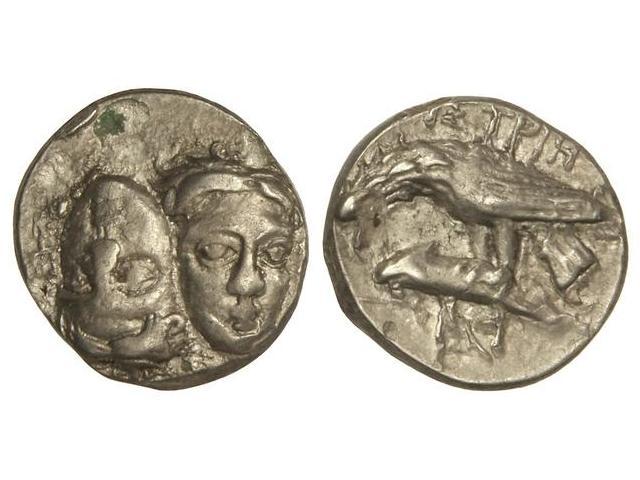 Estátera. 400-350 a.C. ISTROS. Anv.: Dos caras invertidas. Rev.: Águila con delfín, debajo sin A. AR. (Hojas). Se-1669 var. MBC.