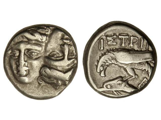 Estátera. - 400-350 a.C. - ISTROS. TRACIA. - Anv.: Dos cabezas masculinas, una derecha y otra invertida. Rev.: Águila y delfín a izquierda, encima leyenda. 5,80 grs. AR. Se-1669. MBC/MBC+.. - -